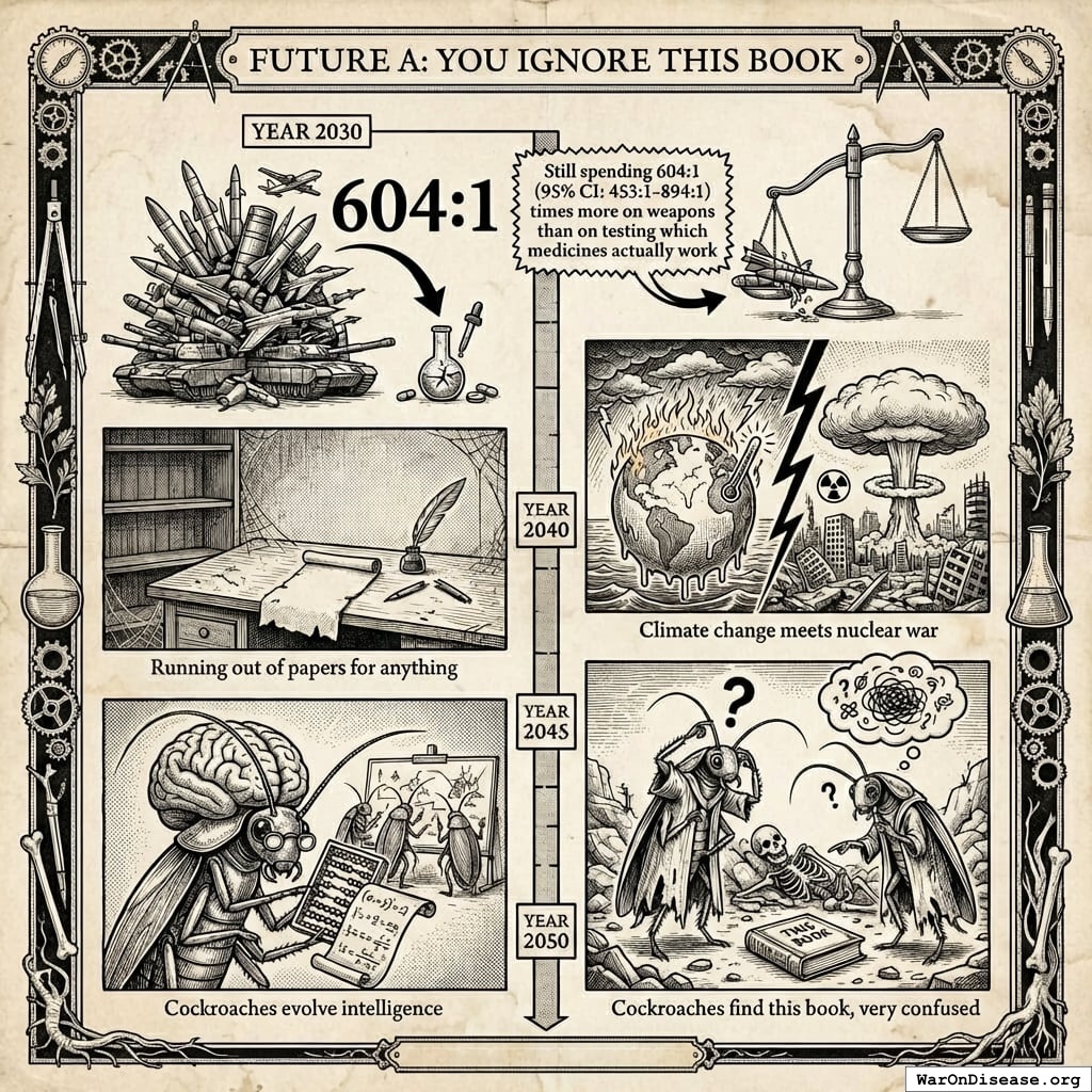 Year 2030: Still spending 604:1 (95% CI: 453:1-894:1) times more on weapons than on testing which medicines actually work