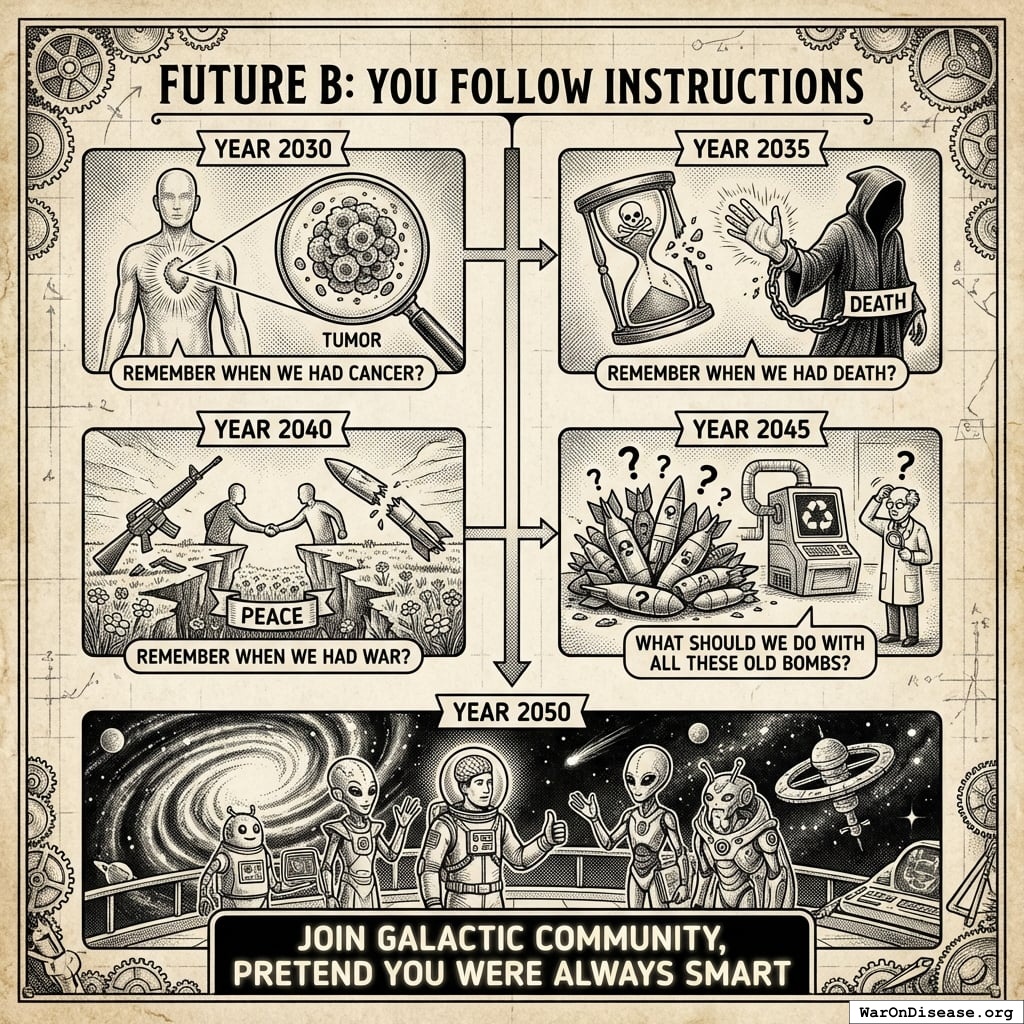 A futuristic timeline illustrating humanity’s progression from 2030 to 2050, highlighting milestones such as curing cancer, ending war, and joining a galactic community.