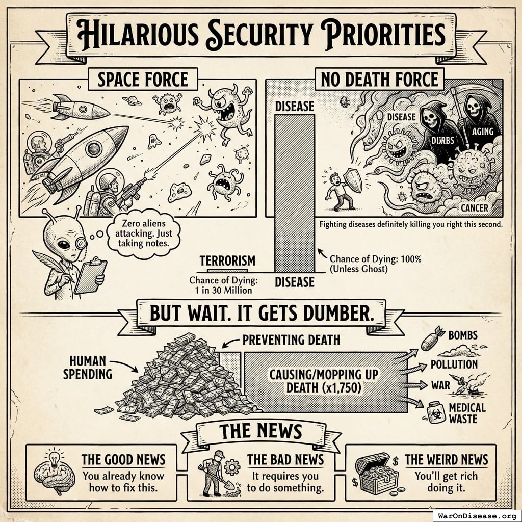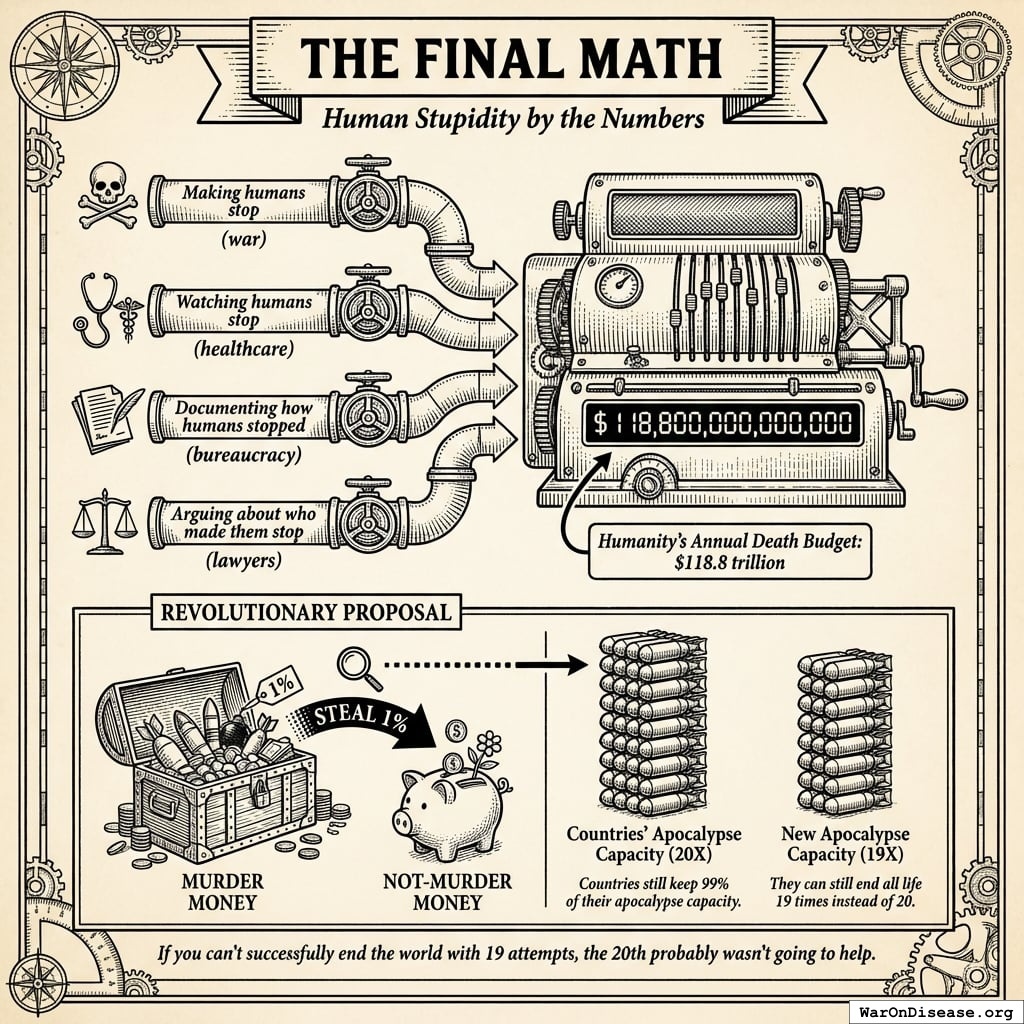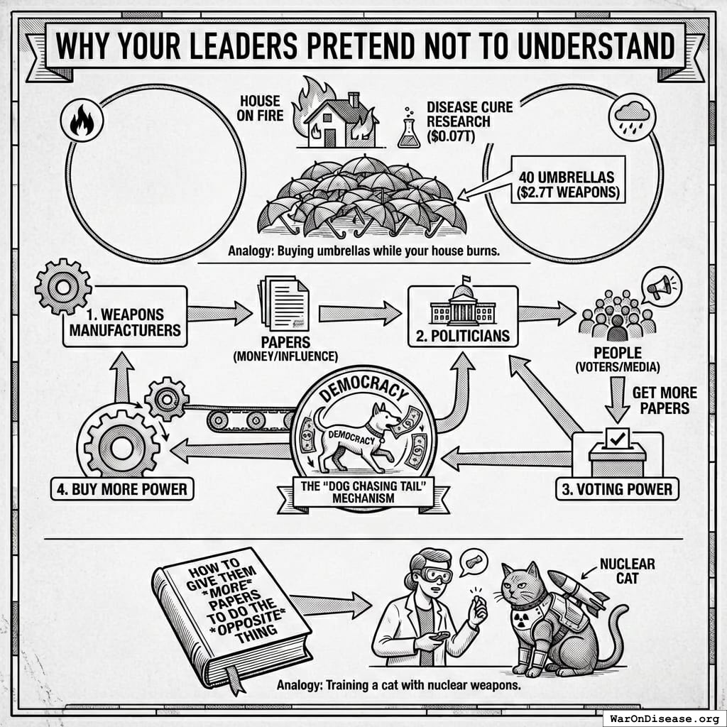 Your leaders aren’t confused. They understand that spending $2.7 trillion on weapons while spending $0.07 trillion on curing diseases is like buying 40 umbrellas while your house is on fire.