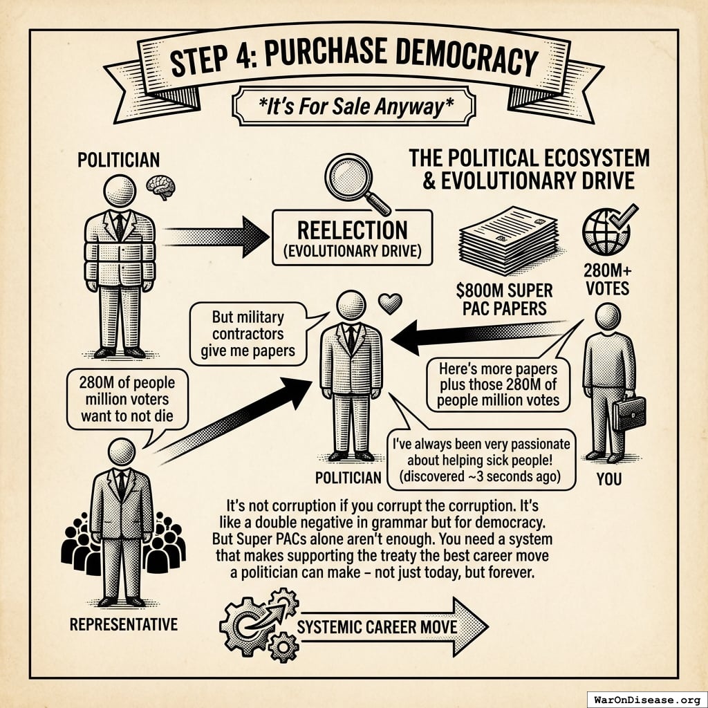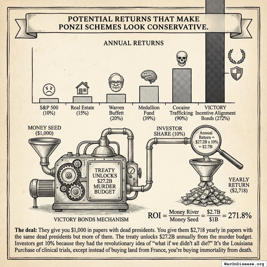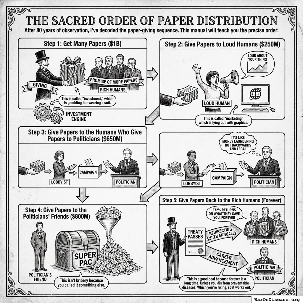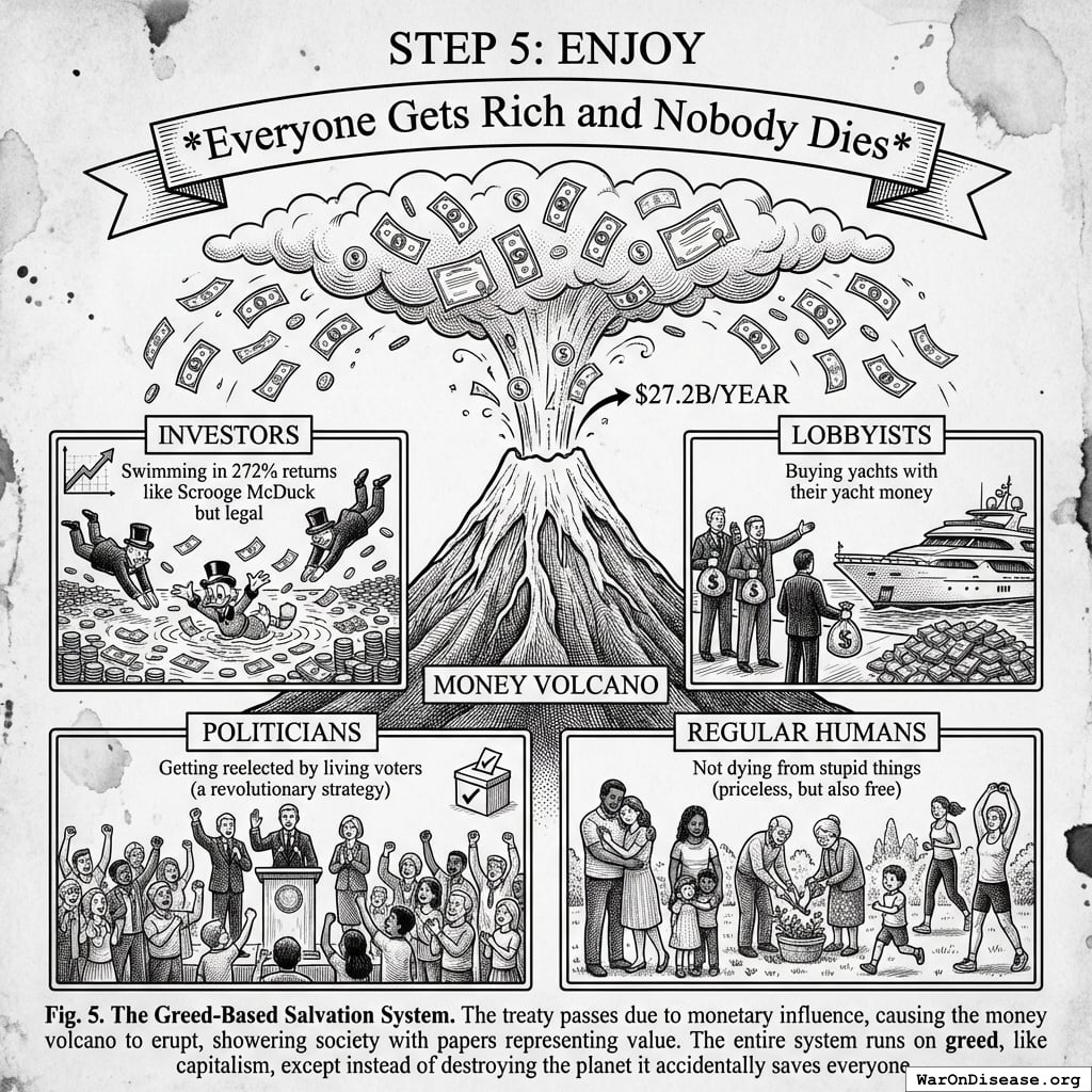 The treaty passes, redirecting $27.2B in papers annually. Rich humans get 272% returns on what they gave you, forever. Politicians get career advancement from voting yes (the same fund pays for both). This is a good deal because forever is a long time. Unless you die from preventable diseases. Which you’re fixing, so it works out.