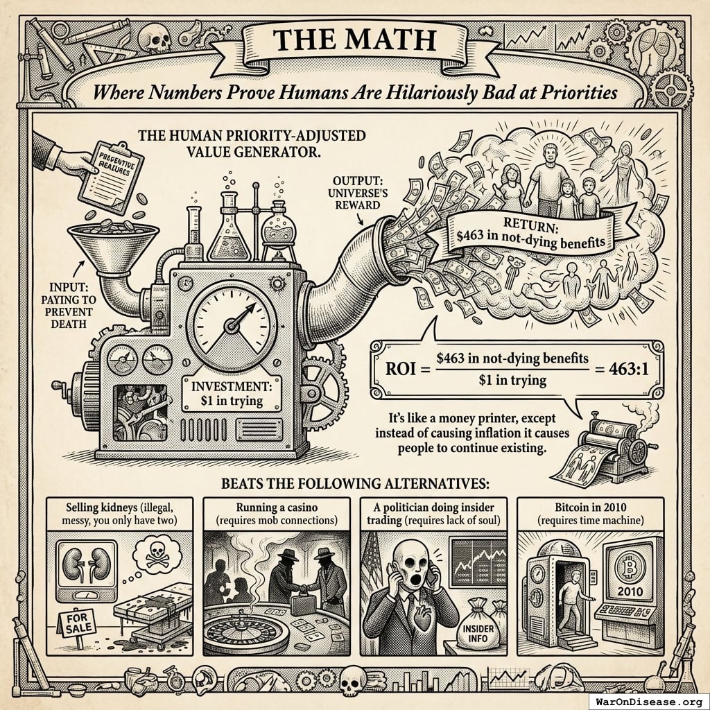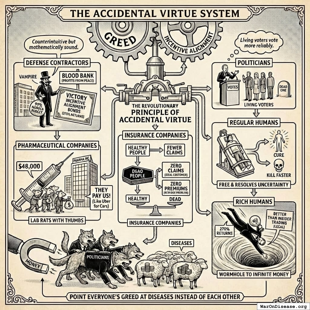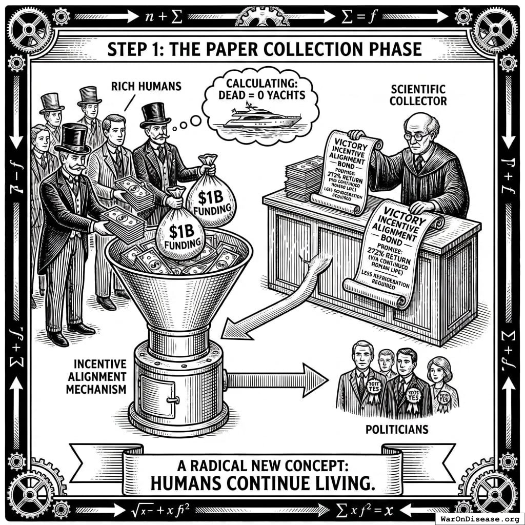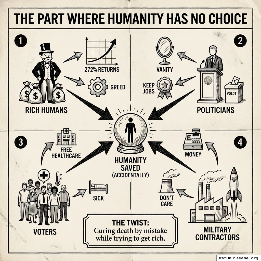 The treaty passes, redirecting $27.2B in papers annually. Rich humans get 272% returns on what they gave you, forever. Politicians get career advancement from voting yes (the same fund pays for both). This is a good deal because forever is a long time. Unless you die from preventable diseases. Which you’re fixing, so it works out.