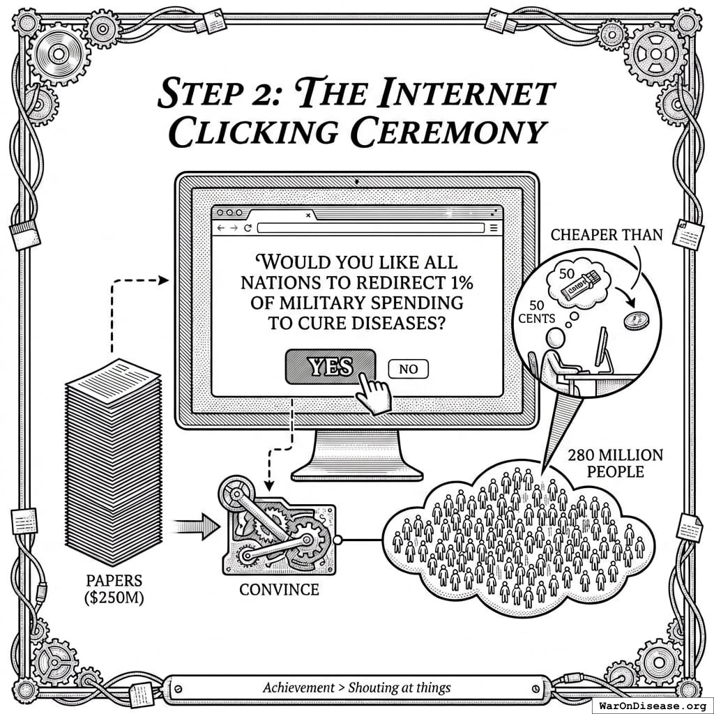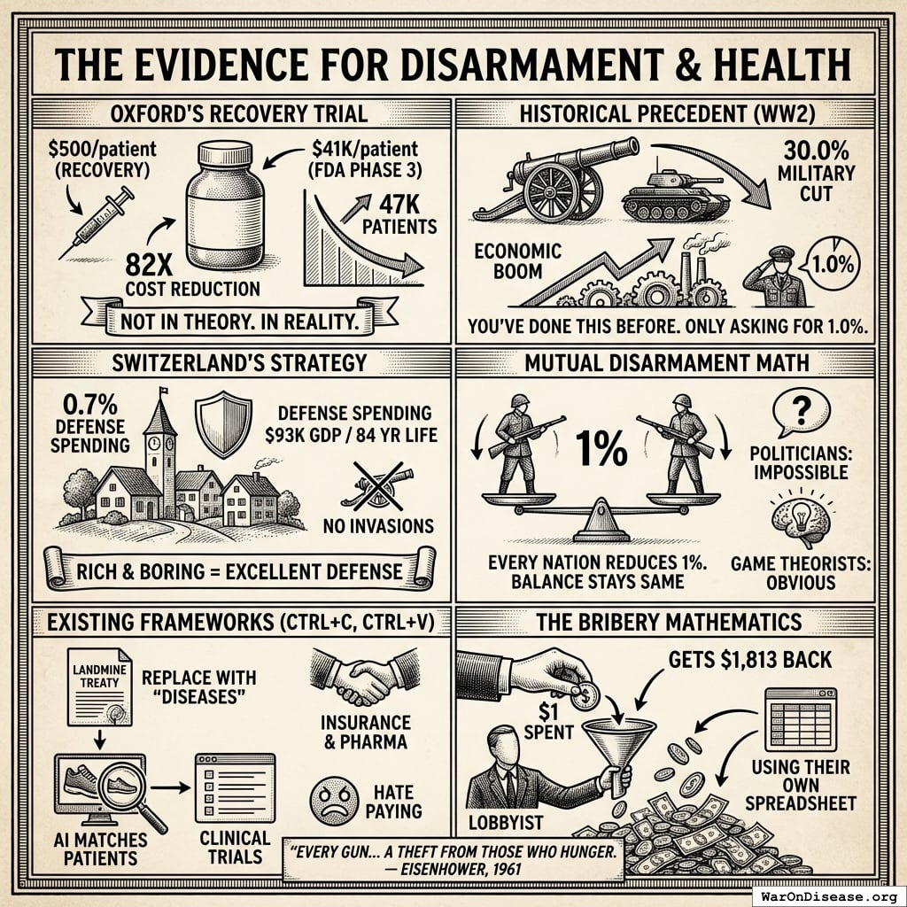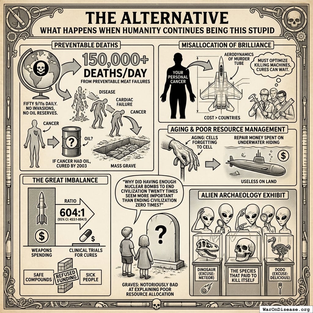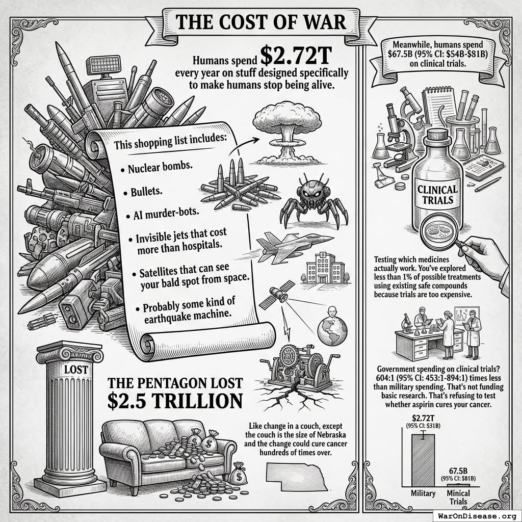 Global military spending: $2.7 trillion (2024, SIPRI) Global government medical research: $68 billion (2024) Actual ratio: 39.7:1 in favor of weapons over medical research Military R&D alone: $85B (2004 data, 10% of global R&D) Military spending increases crowd out health: 1% ↑ military = 0.62% ↓ health spending Note: Ratio actually worse than 36:1. Each 1% increase in military spending reduces health spending by 0.62%, with effect more intense in poorer countries (0.962% reduction) Additional sources: https://www.sipri.org/commentary/blog/2016/opportunity-cost-world-military-spending | https://pmc.ncbi.nlm.nih.gov/articles/PMC9174441/ | https://www.congress.gov/crs-product/R45403
