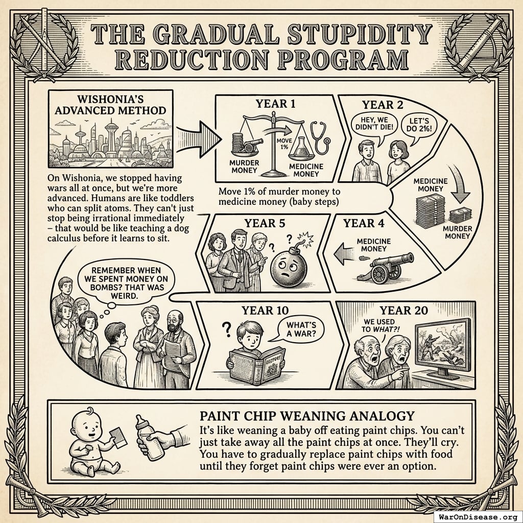 A timeline illustrating the Gradual Stupidity Reduction Program’s 20-year transition from military spending to medical funding and cultural evolution.