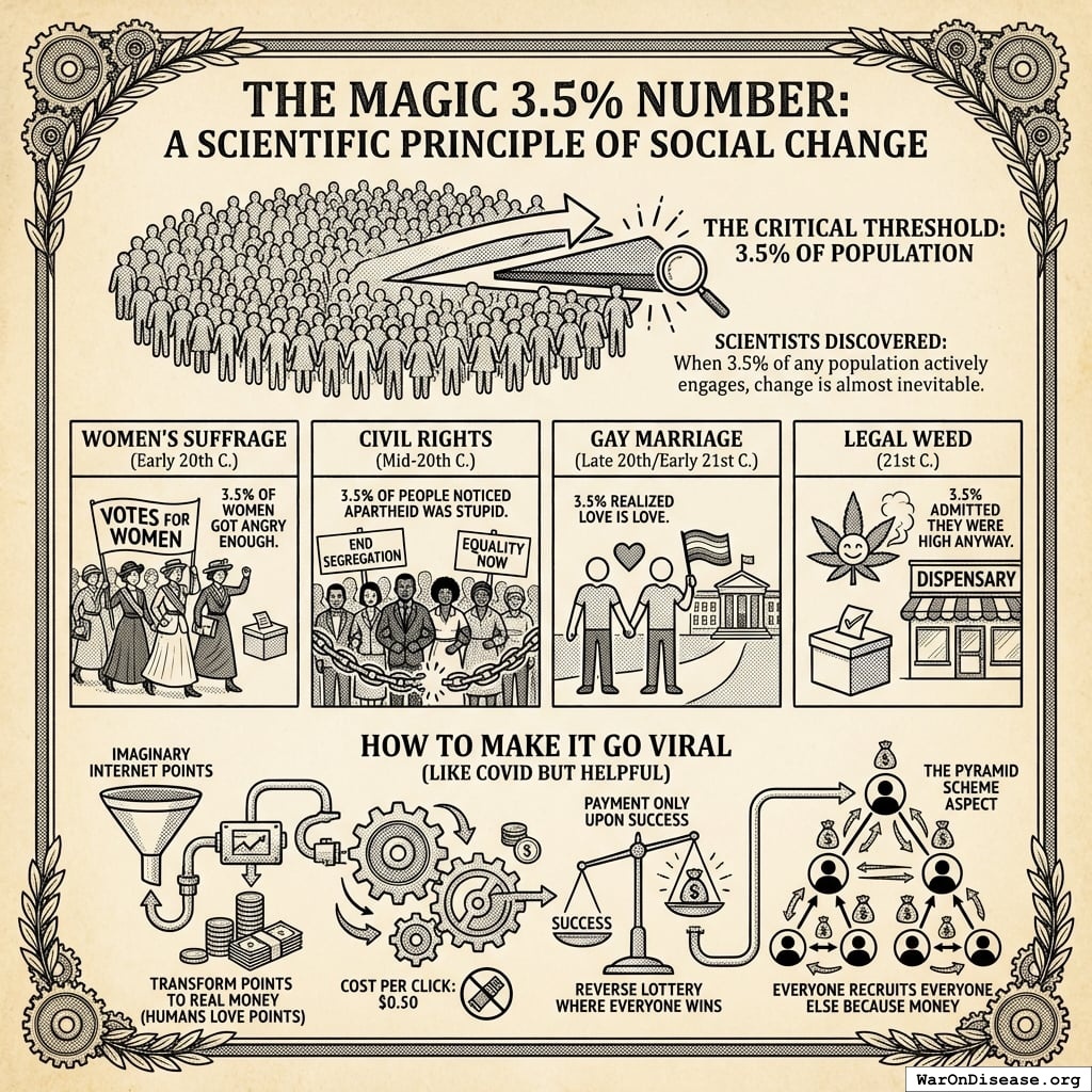 The research found that nonviolent campaigns were twice as likely to succeed as violent ones, and once 3.5% of the population were involved, they were always successful. Chenoweth and Maria Stephan studied the success rates of civil resistance efforts from 1900 to 2006, finding that nonviolent movements attracted, on average, four times as many participants as violent movements and were more likely to succeed. Key finding: Every campaign that mobilized at least 3.5% of the population in sustained protest was successful (in their 1900-2006 dataset) Note: The 3.5% figure is a descriptive statistic from historical analysis, not a guaranteed threshold. One exception (Bahrain 2011-2014 with 6%+ participation) has been identified. The rule applies to regime change, not policy change in democracies. Additional sources: https://www.hks.harvard.edu/centers/carr/publications/35-rule-how-small-minority-can-change-world | https://www.hks.harvard.edu/sites/default/files/2024-05/Erica%20Chenoweth_2020-005.pdf | https://www.bbc.com/future/article/20190513-it-only-takes-35-of-people-to-change-the-world | https://en.wikipedia.org/wiki/3.5%25_rule