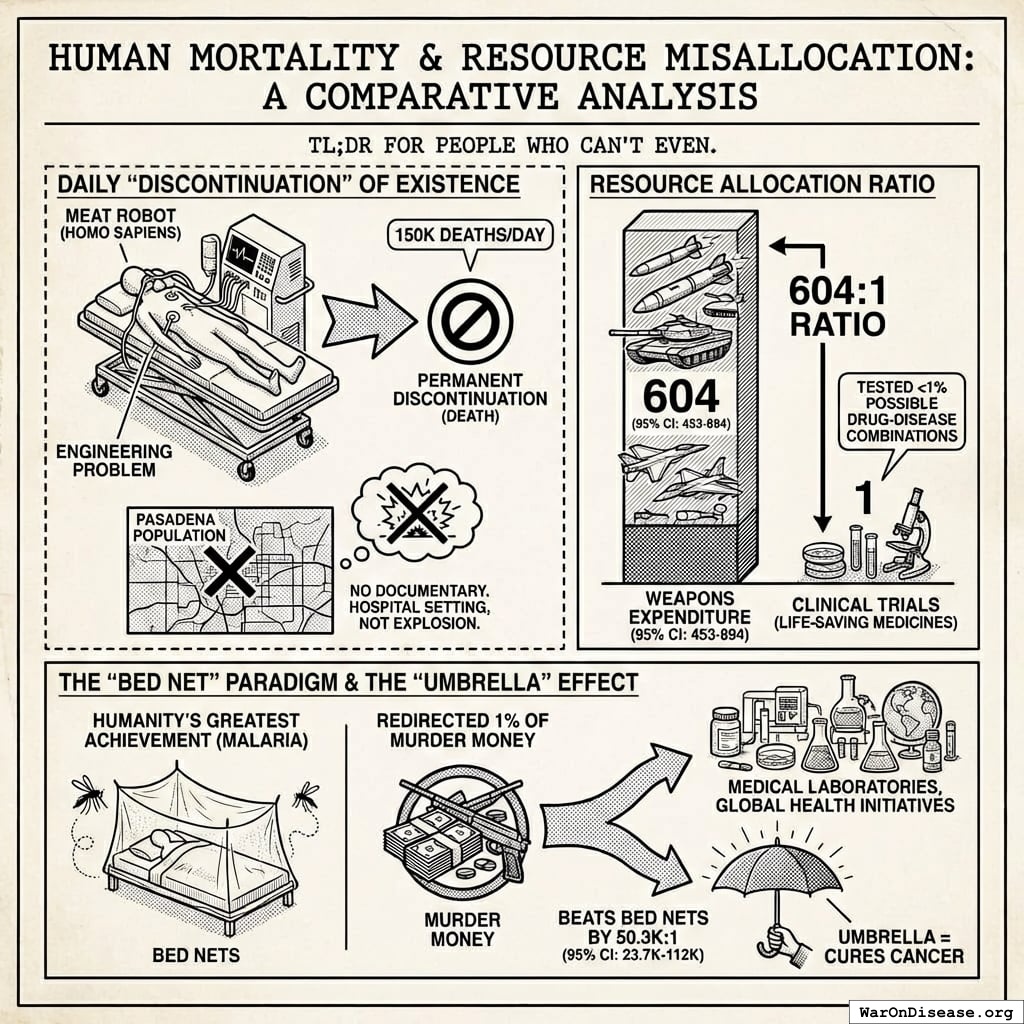 A visualization of the massive disparity between global spending on weaponry and medical testing, illustrating the 604:1 ratio and its associated confidence interval.