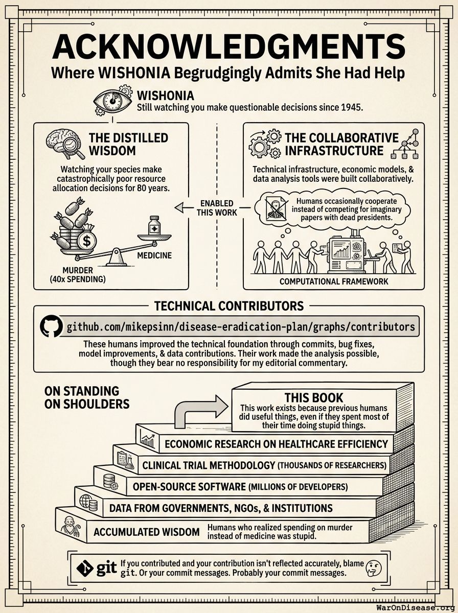 These humans improved the project’s technical foundation through commits, bug fixes, model improvements, and data contributions. Their work made the analysis possible, though they bear no responsibility for my editorial commentary about your species’ adorable tendency to spend 40.3:1 (95% CI: 34.3:1-48:1) more on murder than medicine.