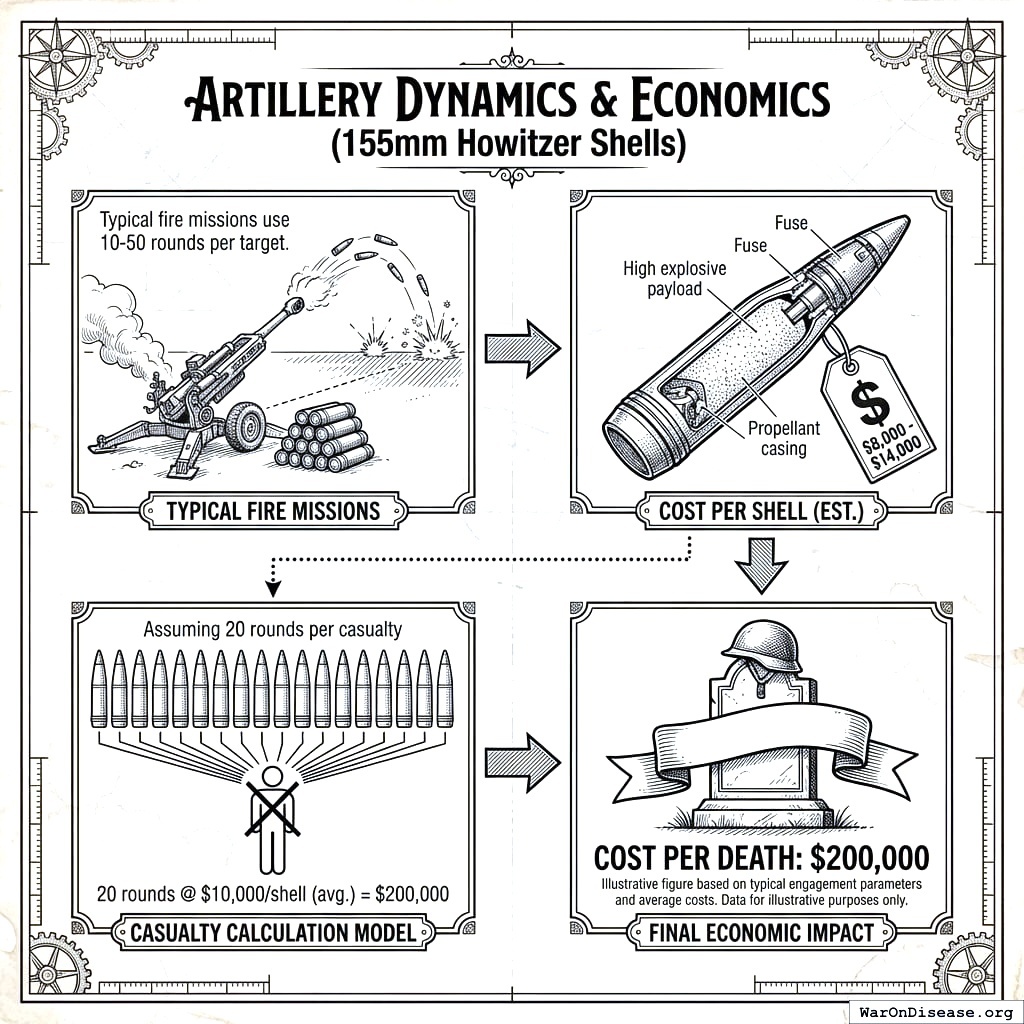 A 5.56mm NATO round costs $0.4 (95% CI: $0.25-$0.6) at bulk military rates7. Global military spending is $2.72T a year.