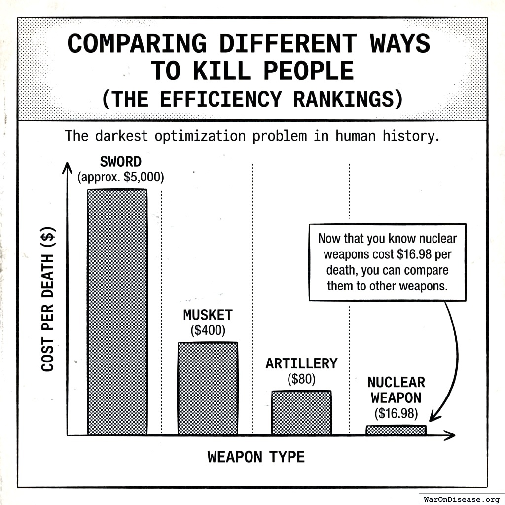 Now that you know nuclear weapons cost $16.98 per death, you can compare them to other methods of killing people. This is the darkest optimization problem in human history. But here we are.