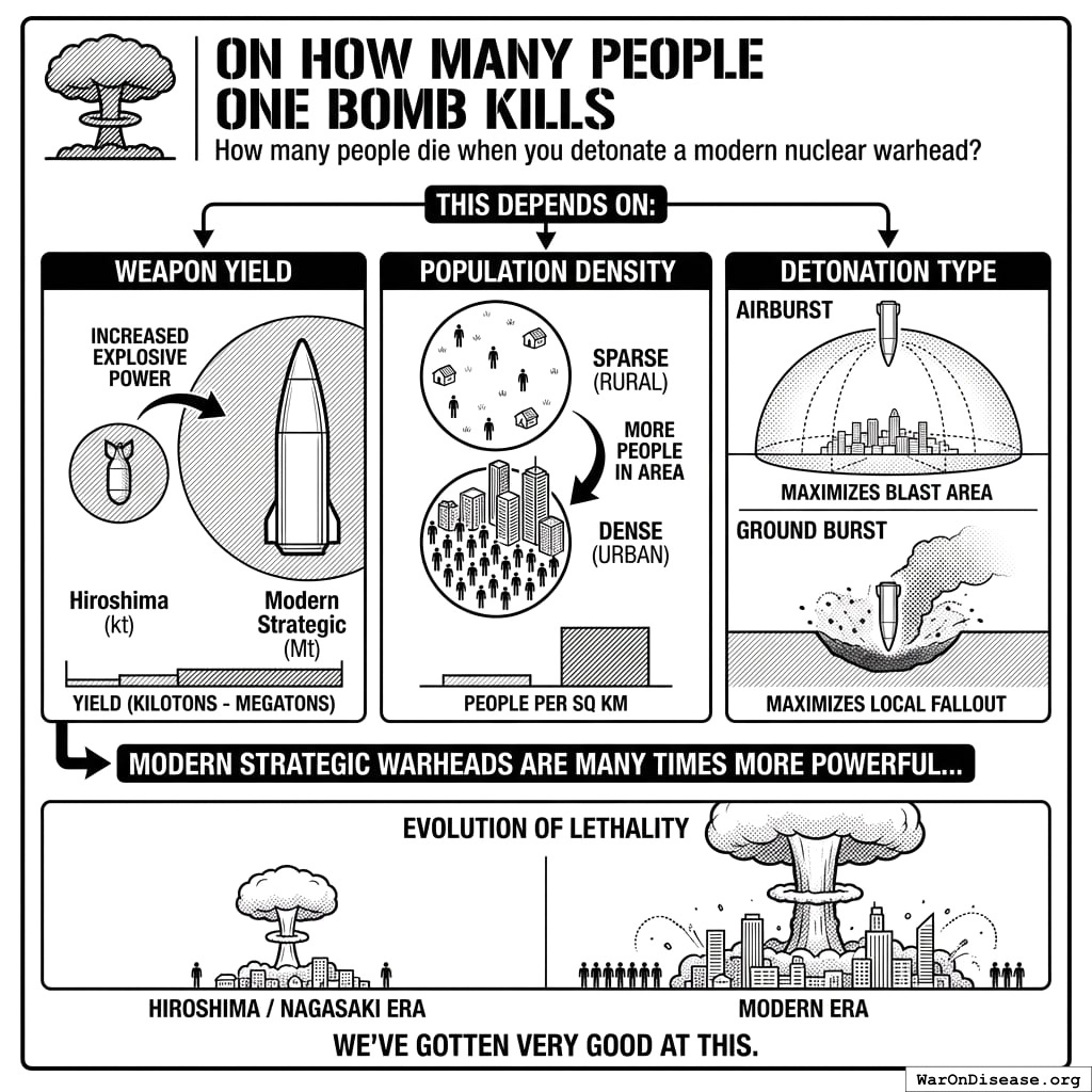 Immediate deaths. Blast, heat, initial radiation. Not counting fallout, disease, starvation, or the collapse of medical infrastructure. Those numbers are much higher. This is the conservative estimate.