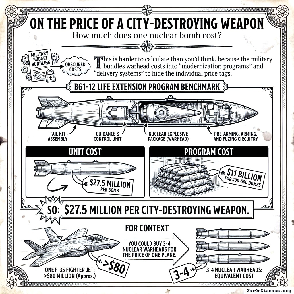 The military bundles warhead costs into “modernization programs” and “delivery systems” to hide the individual price tags, in the same way a restaurant hides the cost of bread by calling it “table service.” But we have the B61-12 Life Extension Program as a benchmark: