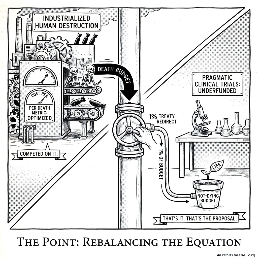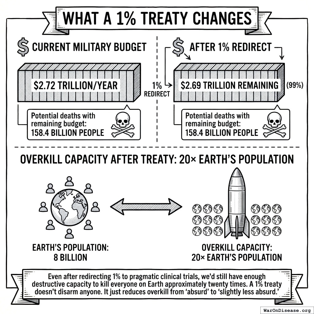 A 1% treaty asks for $27.2B from this surplus. It does not touch deterrence. It does not touch conventional readiness. It takes from the budget line that buys the 2nd through 20th apocalypse and redirects it to clinical trials.