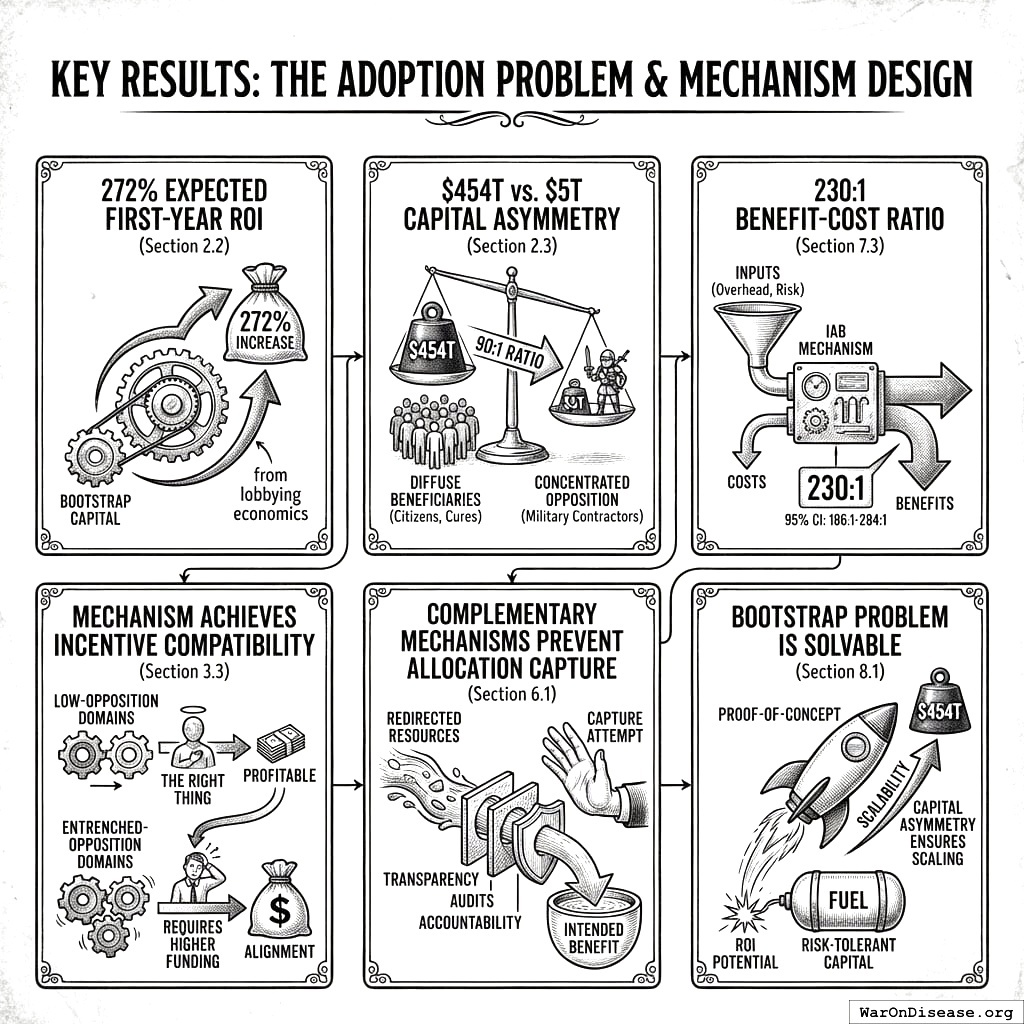 - $454T vs. $5T capital asymmetry ensures diffuse beneficiaries (citizens who’d benefit from cures) can outspend concentrated opposition (weapons manufacturers) by 90:1 (Section 2.3)