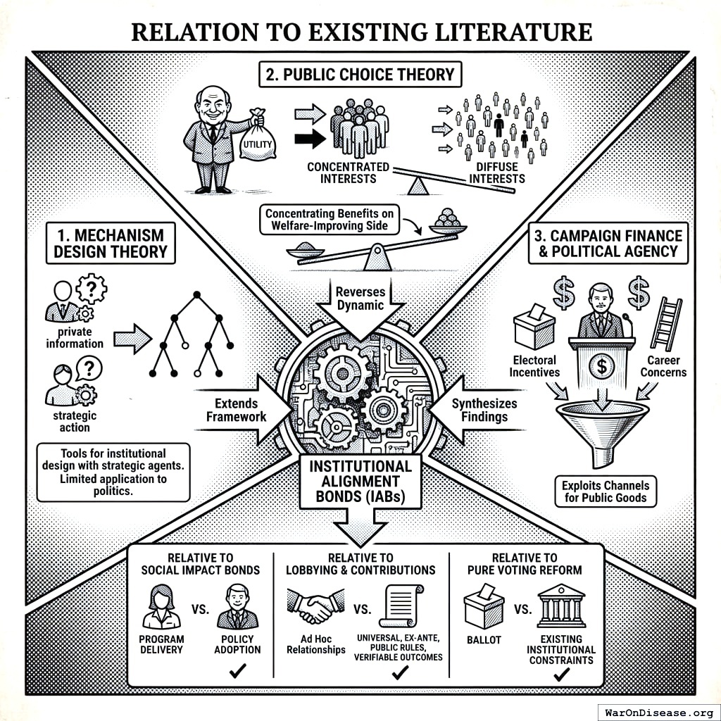 Unlike Social Impact Bonds (which align service providers with program outcomes), IABs align the actors who control large-scale budget decisions, the politicians, with public-good production. Unlike lobbying (which aligns politicians with narrow interests), IABs align politicians with measurable, welfare-improving outcomes. Unlike campaign contributions (which are ad hoc and candidate-specific), IABs create universal, ex-ante rules tied to objective metrics. And unlike new taxation or deficit spending, IABs fund public goods by displacing harmful or wasteful expenditure.