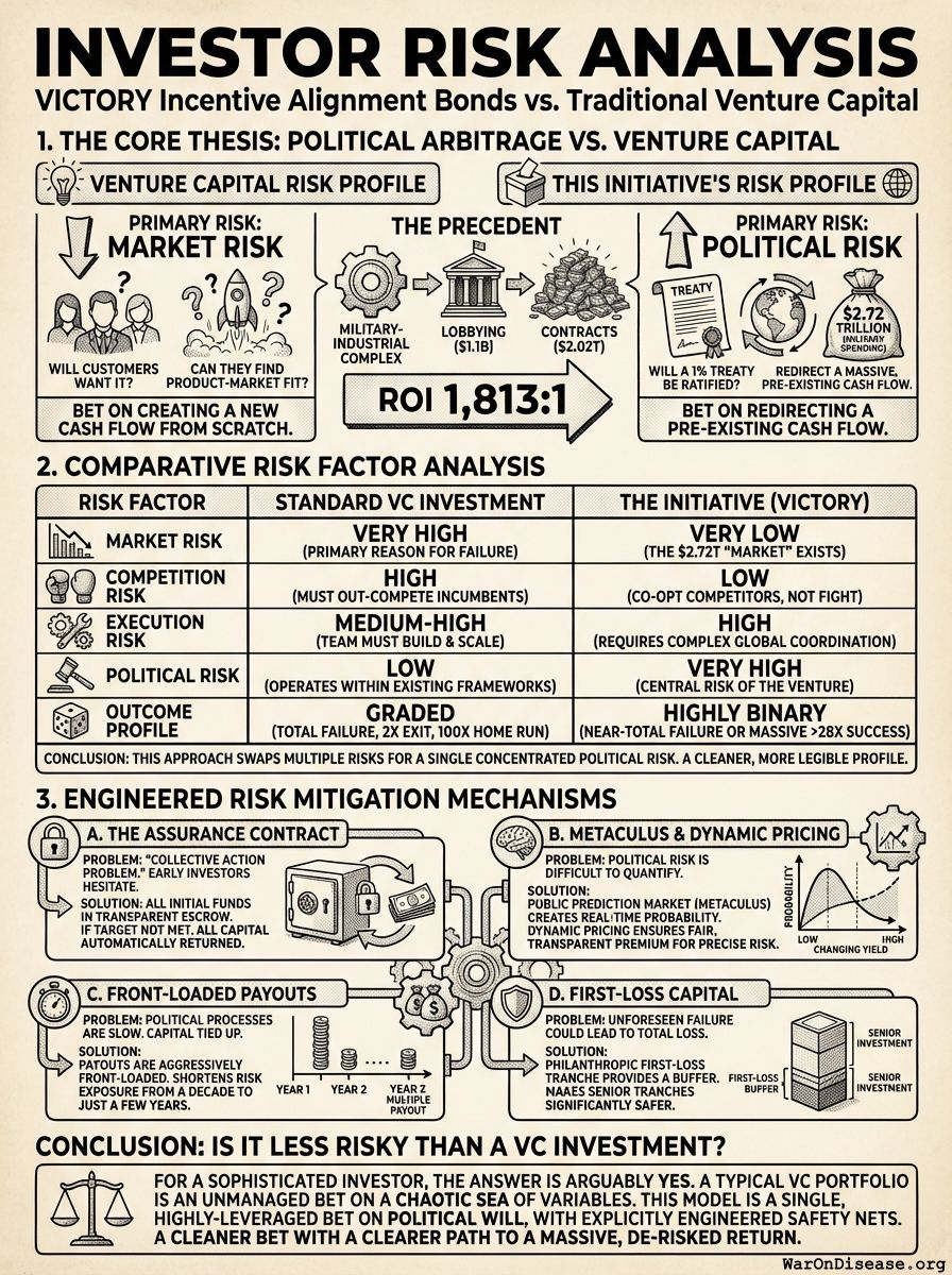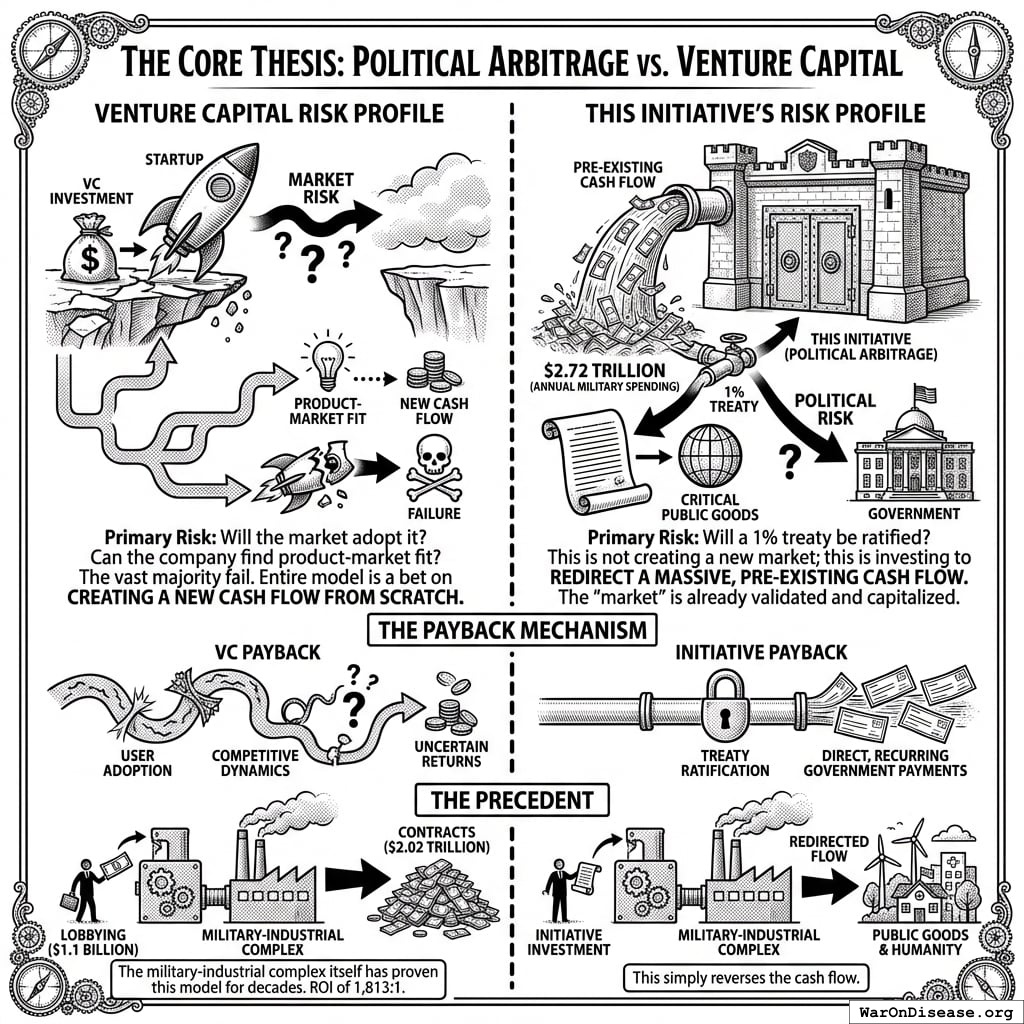 This Initiative’s Risk Profile: This initiative is a political effort to realign global resources towards critical public goods. The primary risk is Political Risk. Will a 1% treaty be ratified? This is not trying to create a new market; this is investing to redirect a massive, pre-existing cash flow ($2.72 trillion in annual military spending72). The “market” is already validated and capitalized.