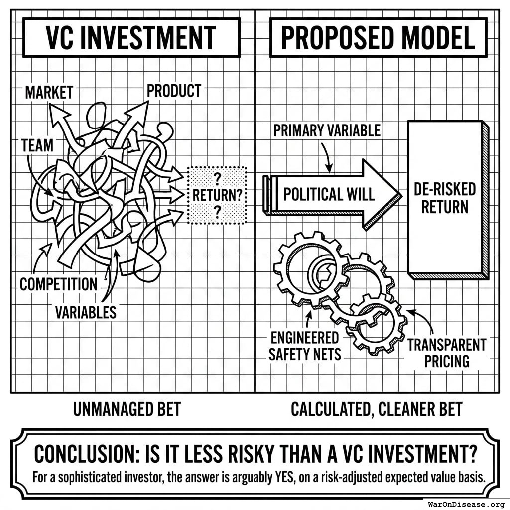 A typical VC portfolio is an unmanaged bet on a chaotic sea of variables (market, team, product, competition). This model presents a single, highly-leveraged, and calculated bet on a primary variable (political will), with multiple, explicitly engineered safety nets and transparent pricing. It is a cleaner bet with a clearer path to a massive, de-risked return.