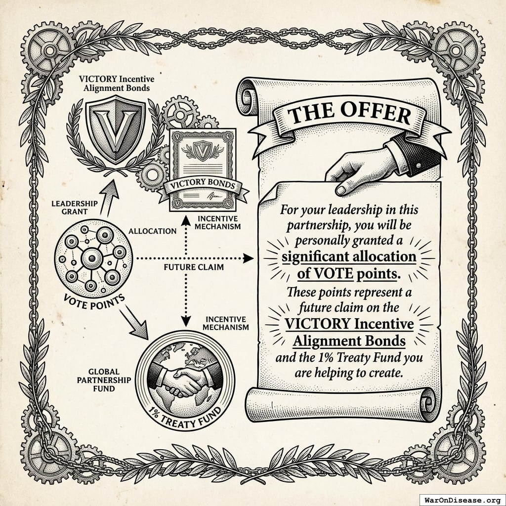 “For your leadership in this partnership, you will be personally granted a significant allocation of VOTE points. These points represent a future claim on the VICTORY Incentive Alignment Bonds and the 1% Treaty Fund you are helping to create.”