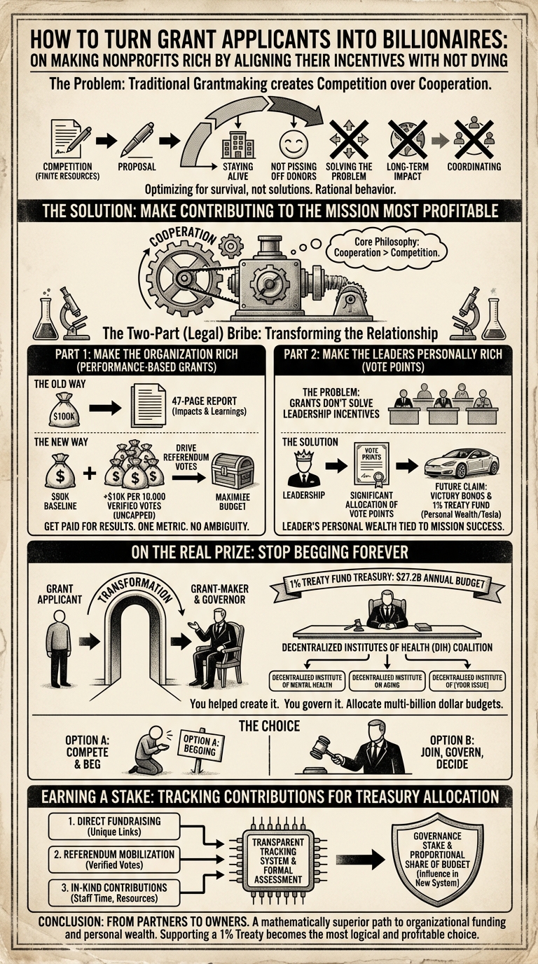 This dual-incentive model transforms the traditional, often inefficient, grantor-grantee relationship into a true, performance-based partnership. By offering a mathematically superior path to both organizational funding and personal wealth creation, you make supporting a 1% treaty the most logical and profitable choice for your non-profit partners and their leaders.