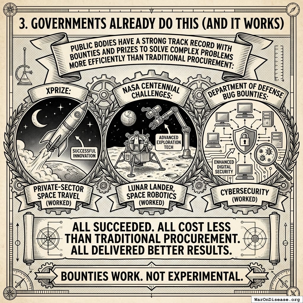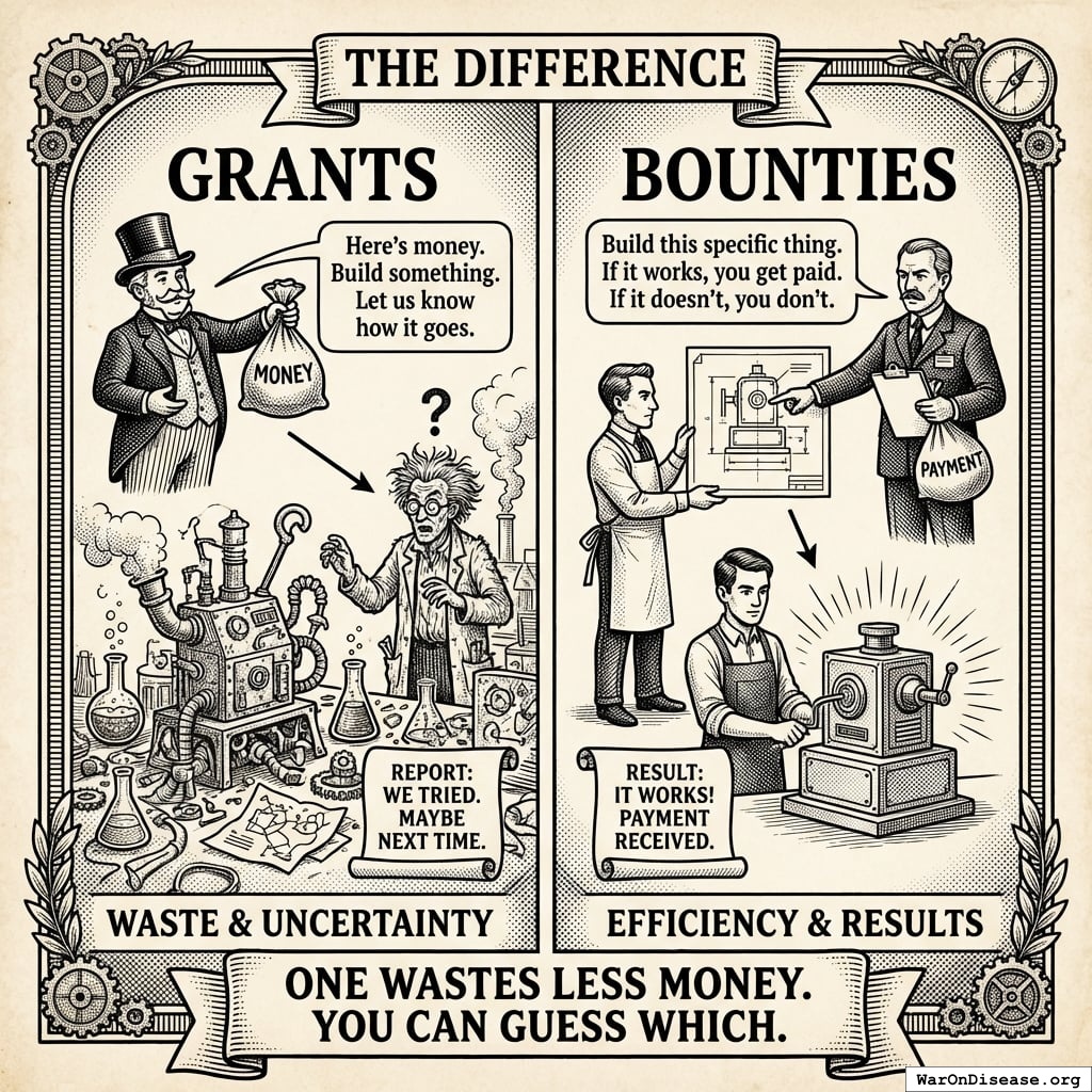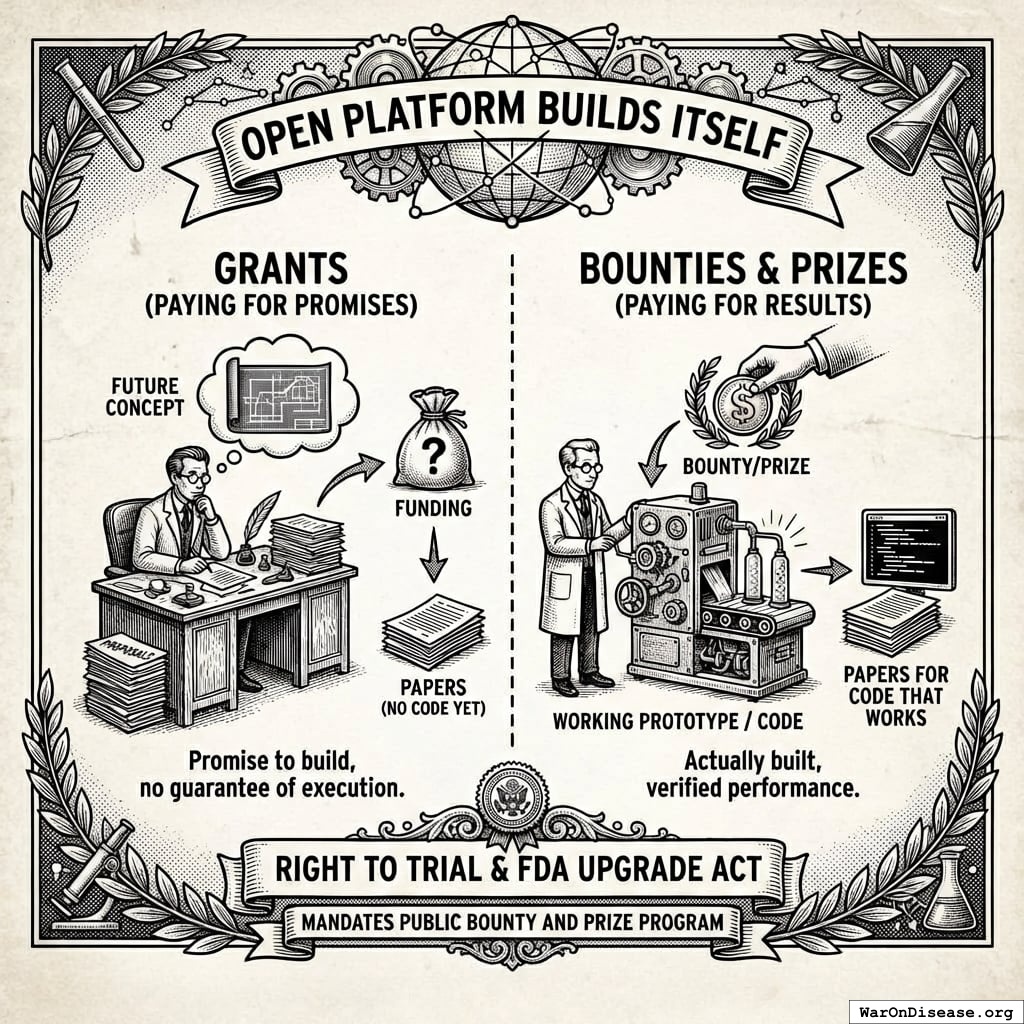 The “Right to Trial & FDA Upgrade Act” mandates a public bounty and prize program. Not grants (pay people who promise to build). Bounties (pay people who actually built it).