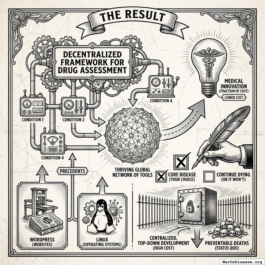 Your decentralized framework for drug assessment can foster a thriving global network of tools that delivers medical innovation at a fraction of the cost of centralized, top-down development.