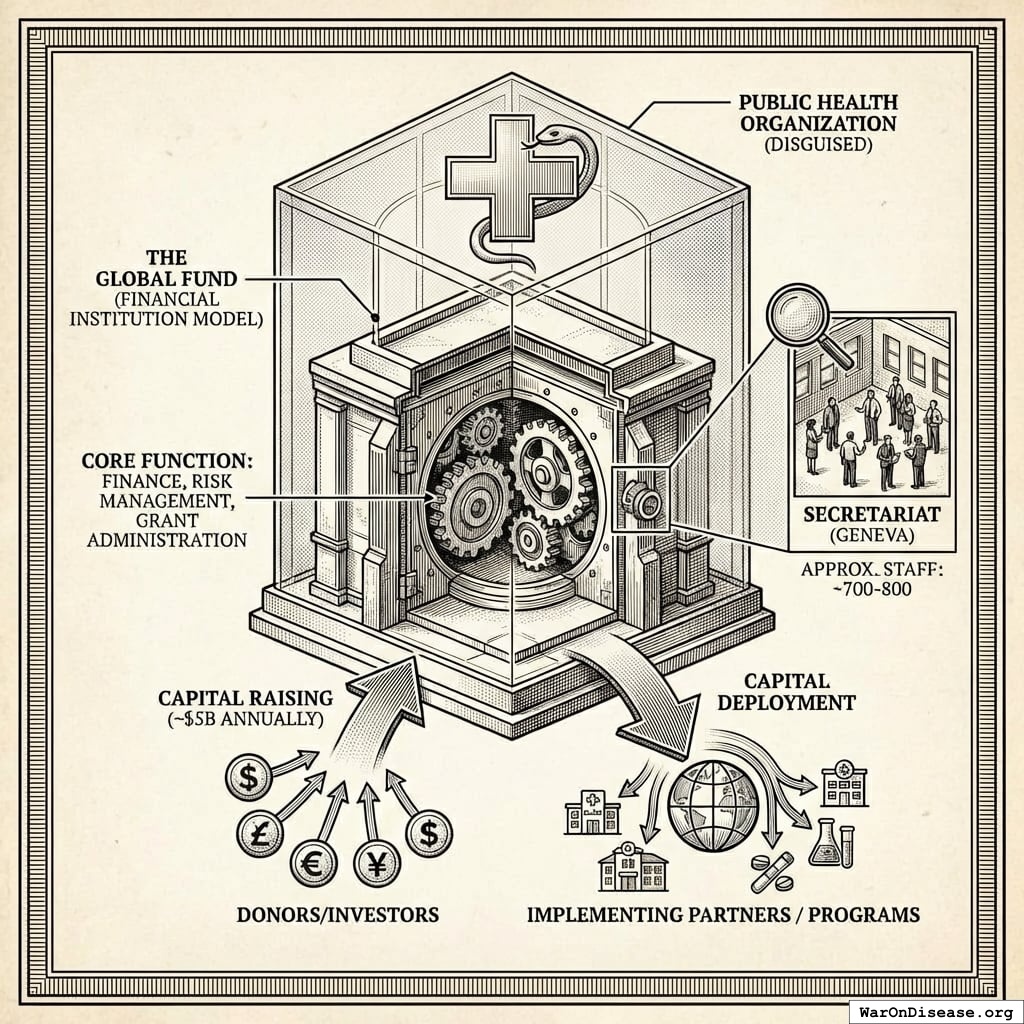 Model: The Global Fund is a financial institution disguised as a public health organization. It does not implement programs directly. Instead, its core function is to raise and deploy capital at massive scale (~$5B/year). Its organizational structure reflects this focus on finance, risk management, and grant administration.