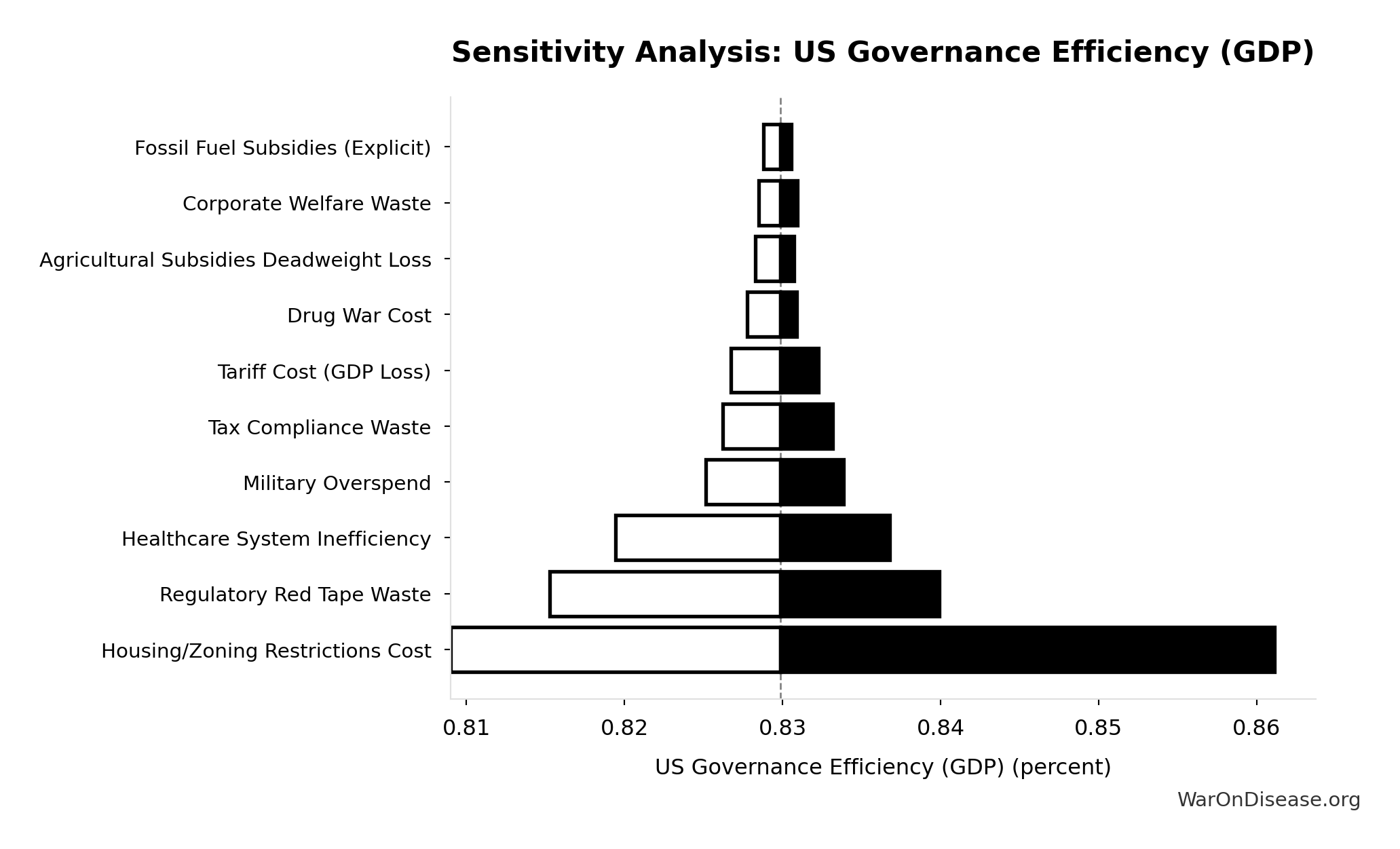 Overlap discount factor between US government waste categories. Set to 1.0 (no discount). Categories are treated as additive, recognizing that any overlap is offset by excluded categories (state/local inefficiency, implicit subsidies, behavioral effects).