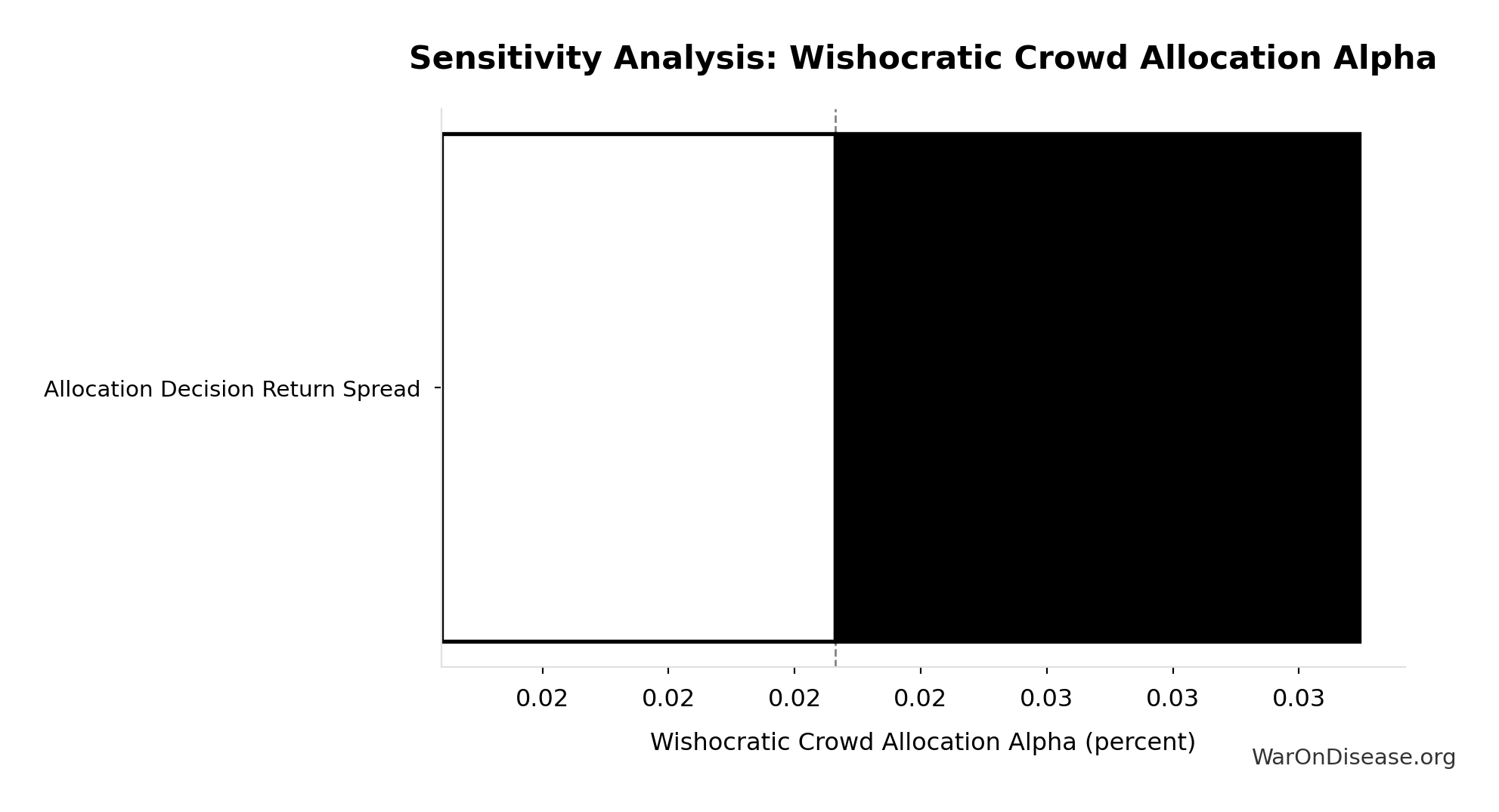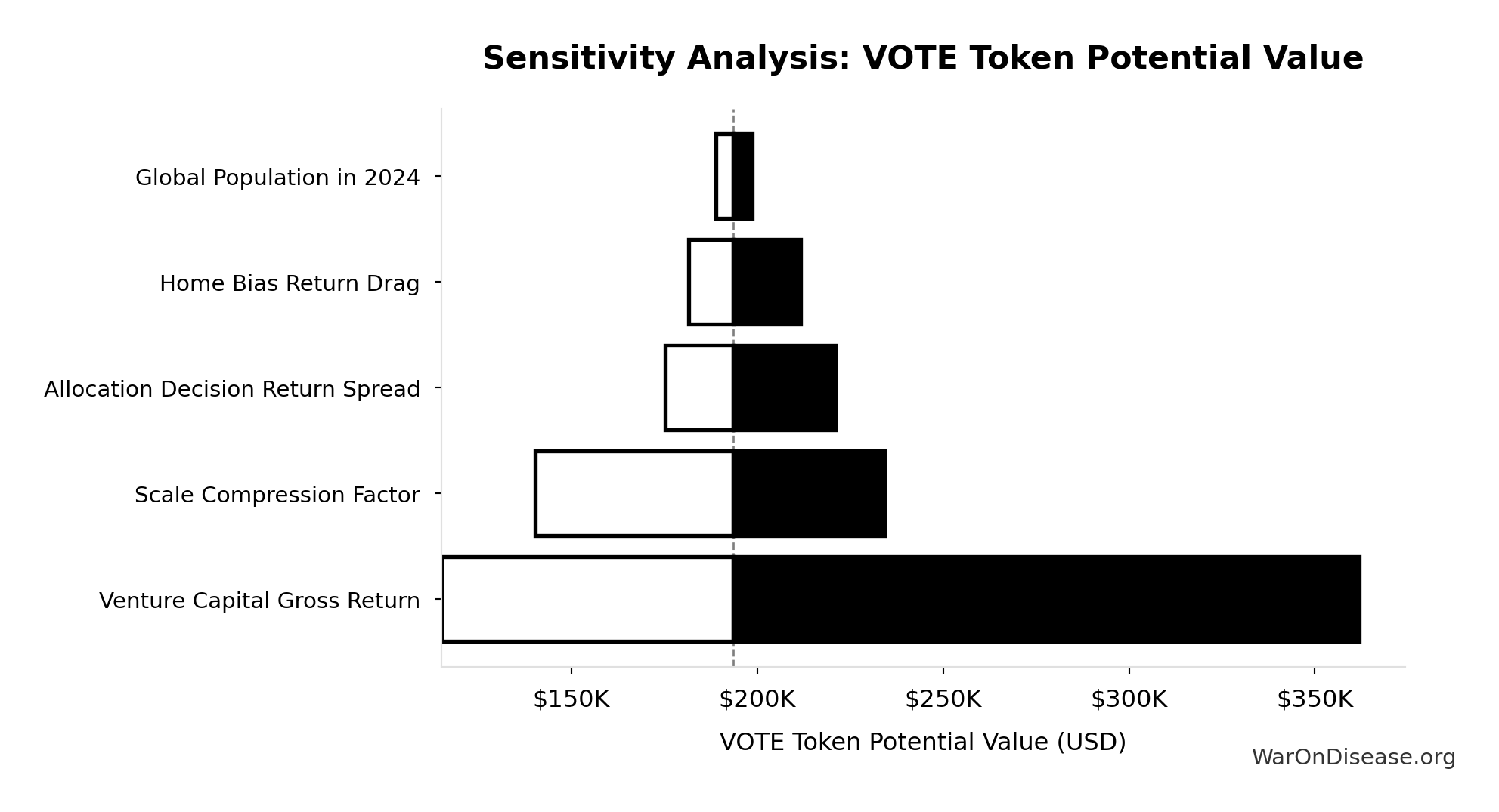 Diminishing-returns drag as the venture market expands ~15x (current global VC ~$300B/yr; wishocratic fund deploys ~$4.7T/yr). More capital chasing deals compresses returns. Partially offset by market expansion (every viable idea gets funded, oligopolies face real competition). Point estimate is moderate; CI spans optimistic to pessimistic.