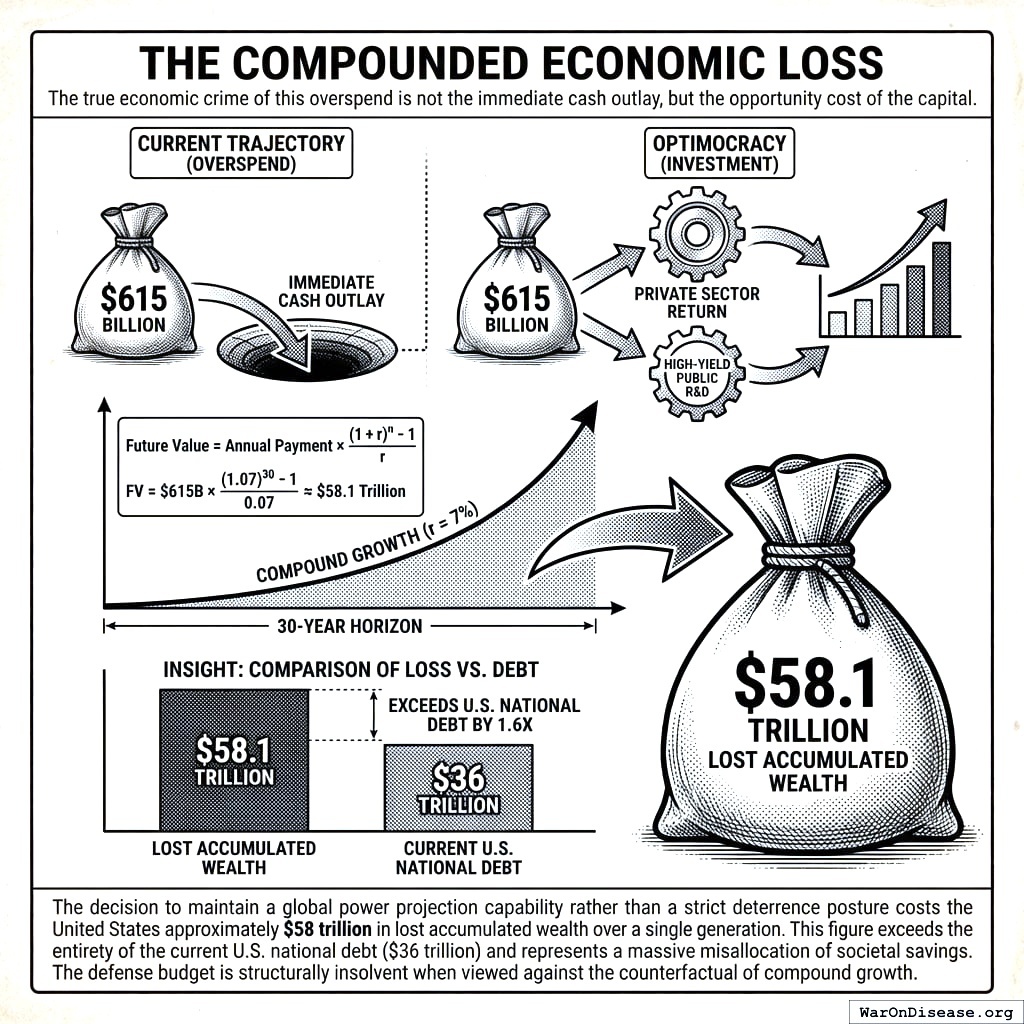 \[\text{FV} = \$615\text{B} \times \frac{(1.07)^{30} - 1}{0.07} \approx \$58.1 \text{ Trillion}\] Insight: The decision to maintain a global power projection capability rather than a strict deterrence posture costs the United States approximately $58 trillion in lost accumulated wealth over a single generation. This figure exceeds the entirety of the current U.S. national debt ($36 trillion)151 and represents a massive misallocation of societal savings. The defense budget is structurally insolvent when viewed against the counterfactual of compound growth.