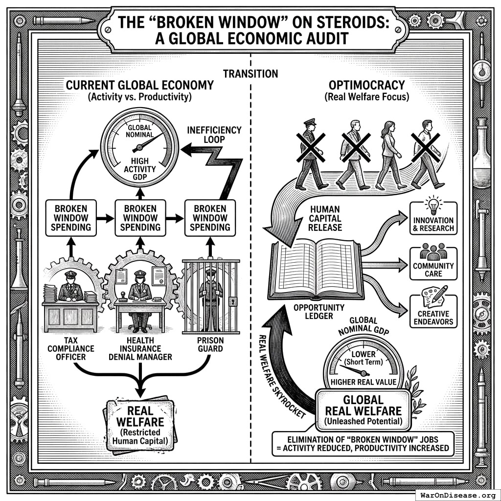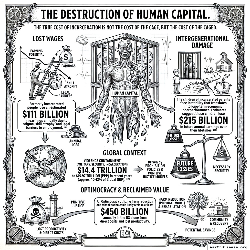 The global cost of containing violence (including military, internal security, and incarceration) was estimated at $14.4 trillion to $19.97 trillion (PPP) in recent years, or roughly 10-12% of Global GDP162. While some security is necessary, the “excess” spending driven by prohibition policies and punitive justice models represents trillions in potential savings. An Optimocracy that utilized harm reduction (the Portugal model) and rehabilitation could likely reclaim at least $450 billion annually in the US alone from direct costs and lost productivity.