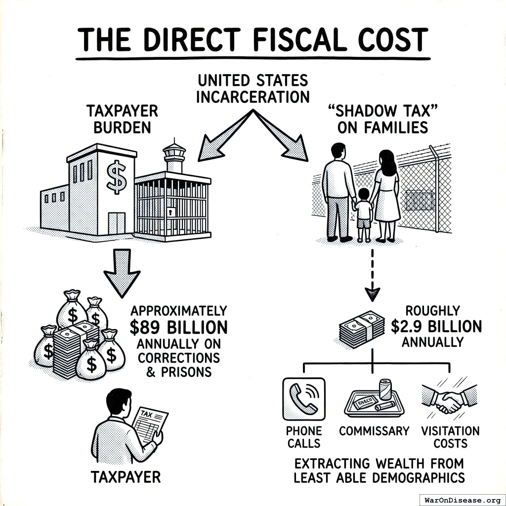 The United States, with one of the highest incarceration rates in the world, spends approximately $89 billion annually on corrections and prisons160. Beyond the taxpayer, families of the incarcerated pay a “Shadow Tax” of roughly $2.9 billion annually for phone calls, commissary, and visitation costs161, extracting wealth from the demographics least able to afford it.