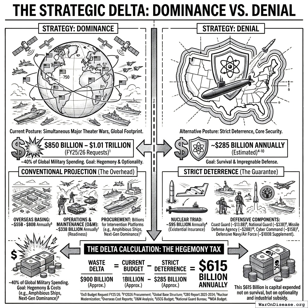 From a mechanism design perspective, this posture is highly inefficient. The “Strict Deterrence” model, an alternative strategy focused on “Denial,” posits that the security of the United States and its core allies can be guaranteed through a robust nuclear triad and impregnable coastal/aerospace defenses, without the massive overhead of expeditionary forces.