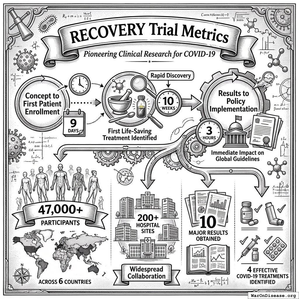 One trial. Over 47,000 participants. Nearly 200 hospital sites, across six countries. Ten results. Four effective COVID-19 treatments... Through discovering four treatments that effectively reduce deaths from COVID-19, it is certain that the study has saved thousands – if not millions – of lives worldwide. Additional sources: https://www.ox.ac.uk/news/features/recovery-trial-two-years
