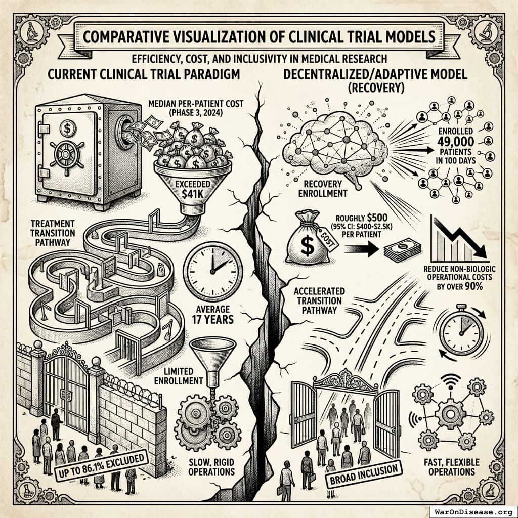 - The U.K. RECOVERY pragmatic trial enrolled 49,000 patients in 100 days at roughly $500 (95% CI: $400-$2.50K) per patient[3], demonstrating that a decentralized, adaptive model can reduce the non-biologic operational costs of clinical research by over 90 percent through automation of data management, monitoring, and administrative functions.
