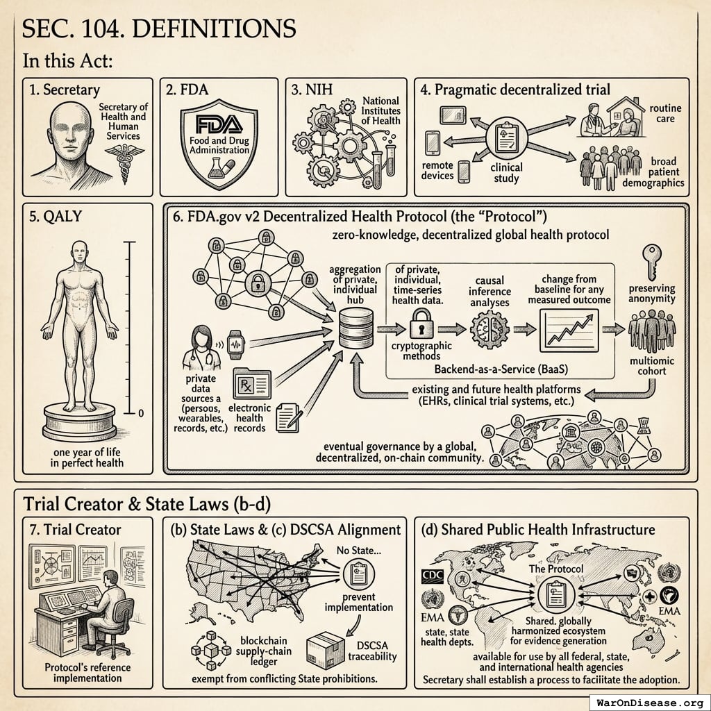 - FDA.gov v2 Decentralized Health Protocol (the “Protocol”) means the zero-knowledge, decentralized global health protocol initiated by the United States. Its primary function is to serve as a secure, open-source public utility that allows for the aggregation of private, individual, time-series health data. The Protocol is designed to perform and publish causal inference analyses on this aggregated data, showing the change from baseline for any measured outcome after any intervention for the multiomic cohort most similar to a given individual, while preserving the anonymity of all data contributors through cryptographic methods. It is intended to function as a Backend-as-a-Service (BaaS) with which existing and future health platforms (EHRs, clinical trial systems, etc.) can integrate, and is intended for eventual governance by a global, decentralized, on-chain community.