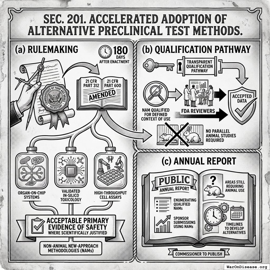 - Rulemaking. Not later than 180 days after enactment, the Secretary, acting through the Commissioner of Food and Drugs, shall issue final regulations amending 21 CFR Parts 312 and 600 to permit non‑animal New‑Approach Methodologies (NAMs), including organ‑on‑chip systems, validated in‑silico toxicology, and high‑throughput cell assays, as acceptable primary evidence of safety where scientifically justified.