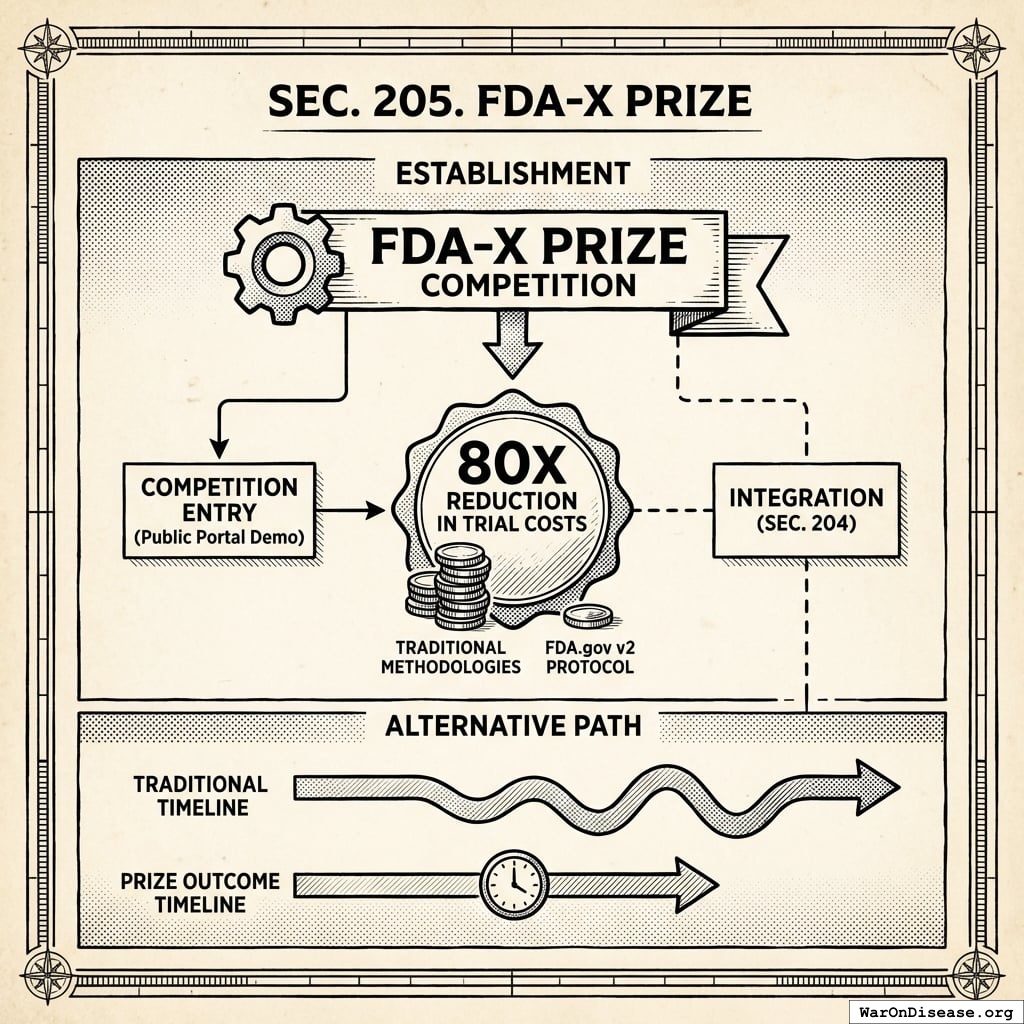 - Establishment. To accelerate the development of the FDA.gov v2 Protocol, the Secretary is authorized to establish an “FDA-X Prize” competition, with a prize purse to be determined by the Secretary, awarded to the entity that first develops and demonstrates a public portal meeting the core requirements outlined in Section 204 and which demonstrates the capacity to achieve at least an 80X reduction in per-patient trial costs compared to traditional methodologies.