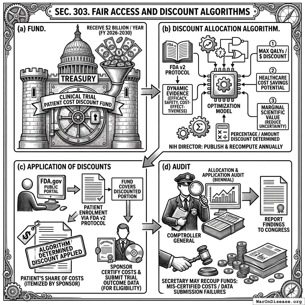 Discount Allocation Algorithm. The NIH Director shall develop, publish, and annually recompute a transparent, open-source optimisation model for the allocation of discounts from the Fund. This model shall determine the percentage or amount of discount applicable to patient-borne costs for participation in specific trials available on the FDA v2 Protocol. The primary objectives for discount allocation shall be: (1) maximizing projected quality-adjusted life-years (QALYs) gained per dollar of discount provided; (2) the potential for significant healthcare system cost savings attributable to the research; and (3) the marginal scientific value of the pragmatic clinical trial, including its potential to reduce uncertainty for interventions with limited existing evidence but high potential impact. The algorithm shall dynamically incorporate new evidence on treatment efficacy, safety, and cost-effectiveness generated through the FDA v2 Protocol.