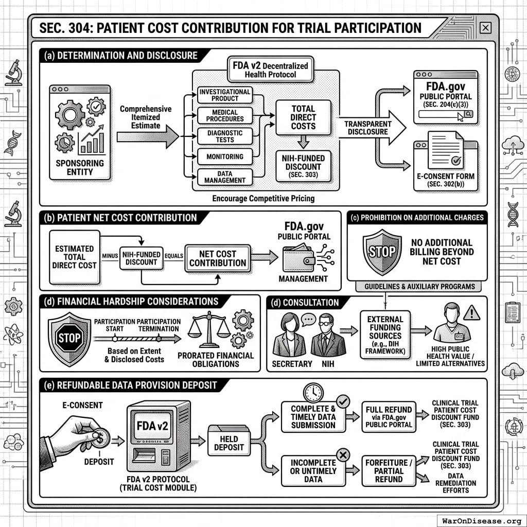 - Determination and Disclosure of Participation Costs. Prior to a patient consenting to a trial, the sponsoring entity shall determine and provide to the FDA v2 Decentralized Health Protocol a comprehensive, itemized estimate of all direct costs associated with that specific patient’s anticipated participation in the trial. This shall include, but not be limited to, costs of investigational product, necessary medical procedures, diagnostic tests, monitoring, and data management directly attributable to the research participant. These estimated costs, alongside the NIH-funded discount applicable under SEC. 303, and the final net cost to the patient, shall be transparently displayed to the potential participant via the FDA.gov Public Portal (SEC. 204(c)(3)) and detailed in the e-consent form (SEC. 302(b)). This transparent disclosure of itemized costs on a decentralized framework is intended to encourage competitive and efficient pricing by sponsoring entities.