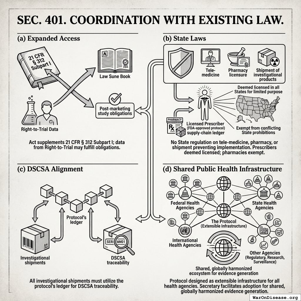 - State Laws. No State or political subdivision may regulate the practice of tele‑medicine, pharmacy licensure, or shipment of investigational products in a manner that prevents implementation of this Act. Specifically, a licensed prescriber participating under an FDA‑approved protocol shall be deemed licensed in all States for the limited purpose of providing investigational treatment under this Act, and pharmacies dispensing or shipping such products pursuant to the blockchain supply‑chain ledger are exempt from conflicting State prohibitions.