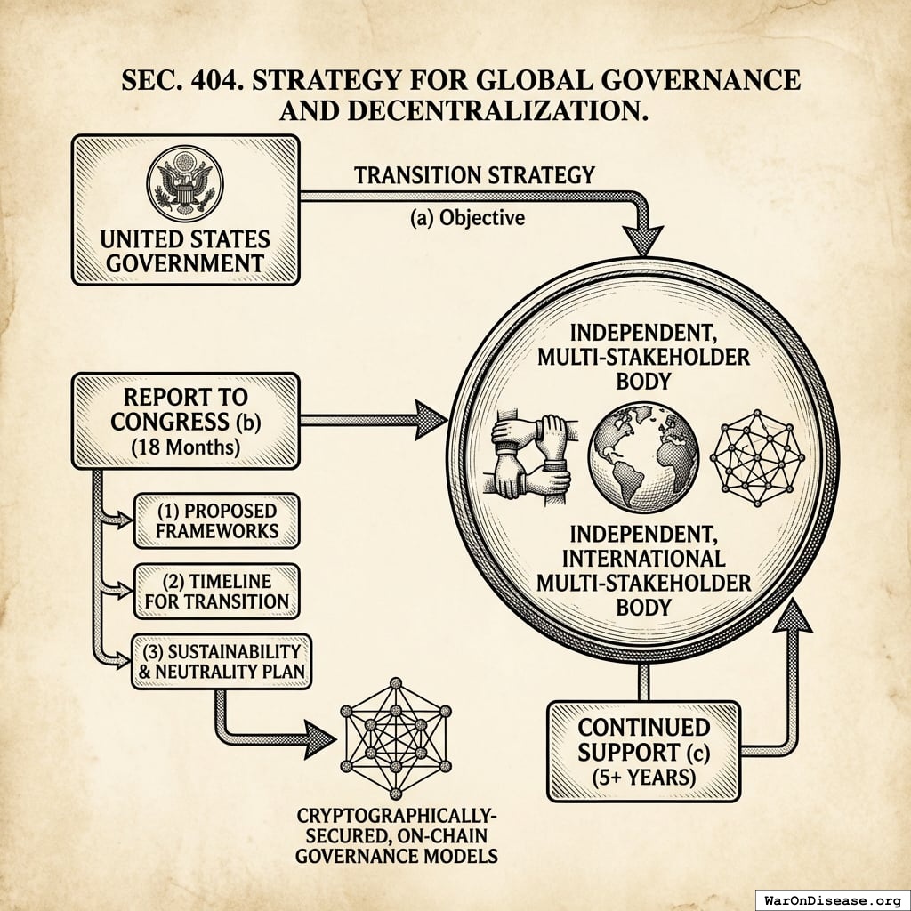 - Report to Congress. Within 18 months of enactment, the Secretary shall submit a report to Congress outlining this strategy, including: (1) proposed frameworks for a new international governance body; (2) a timeline for transitioning technical and administrative oversight; and (3) a plan for ensuring the long-term sustainability and neutrality of the protocol, including research into and pathways toward cryptographically-secured, on-chain governance models that reduce reliance on a central administrative body.