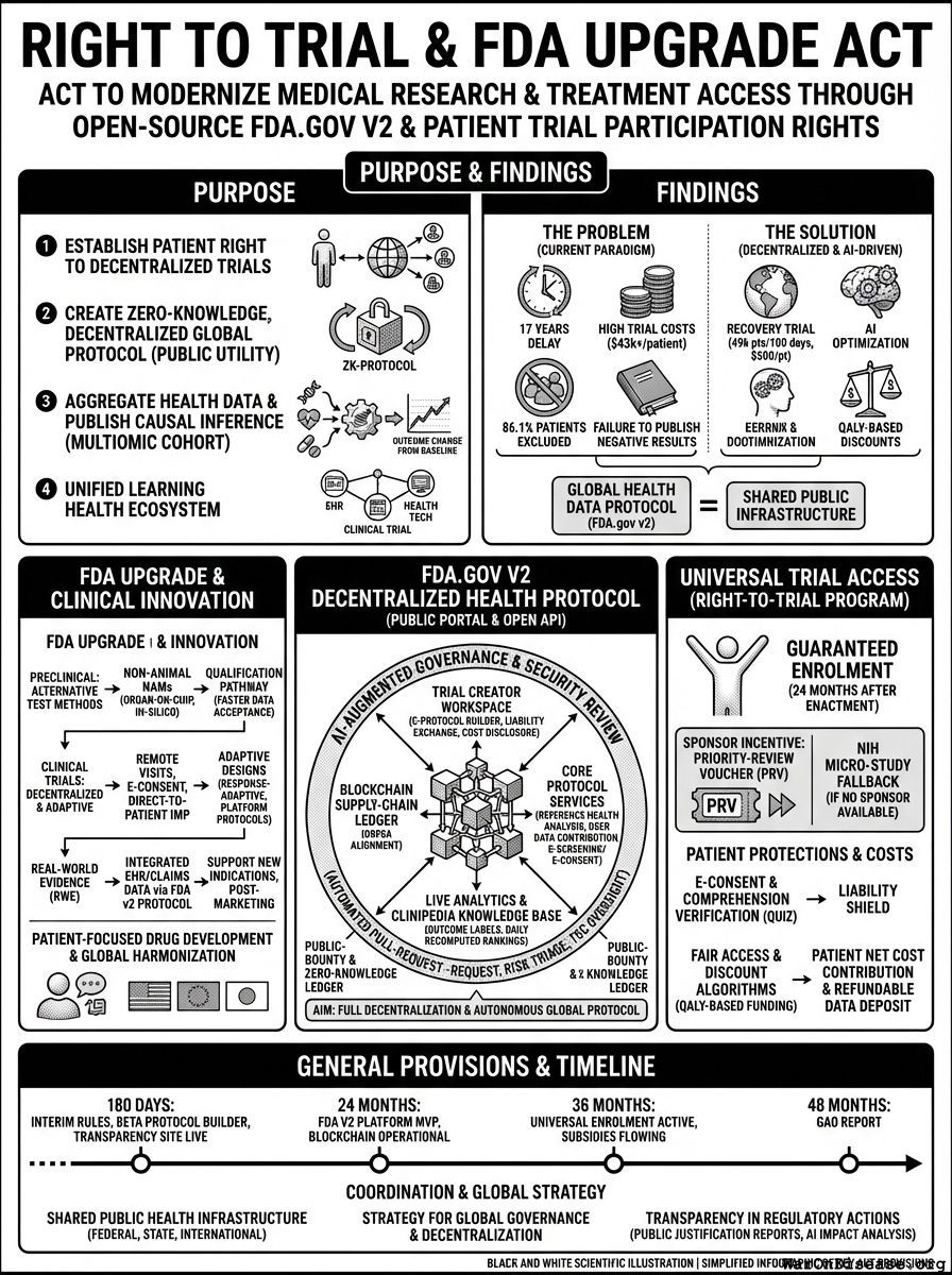 - The establishment of a global health data protocol, analogous to the foundational protocols of the internet, is necessary to securely connect disparate data silos and accelerate medical research worldwide. The FDA.gov v2 Decentralized Health Protocol is the United States’ initial contribution to this protocol, a public utility providing the secure, open-source backend for a new generation of health innovation. It creates a global public good by enabling research on all promising therapies, especially those without commercial potential that are underserved by private-sector research.