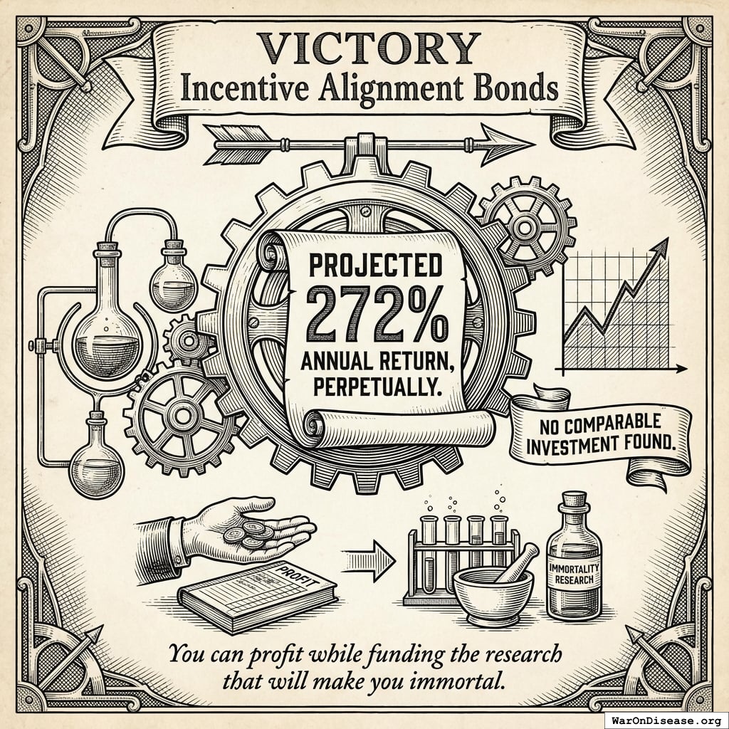 VICTORY Incentive Alignment Bonds offer a projected 272% annual return, perpetually. I could not find a comparable investment. You can profit while funding the research that will make you immortal.