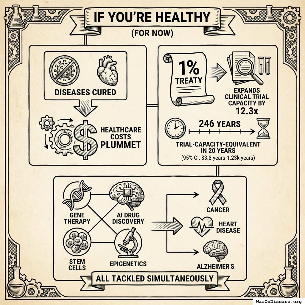 As diseases are cured, healthcare costs plummet. A 1% treaty expands clinical trial capacity by 12.3x (95% CI: 4.19x-61.3x) (246 years (95% CI: 83.8 years-1.23k years) trial-capacity-equivalent years in 20 years). That means cancer, heart disease, Alzheimer’s, all tackled simultaneously by gene therapy, AI drug discovery, stem cells, and epigenetics.