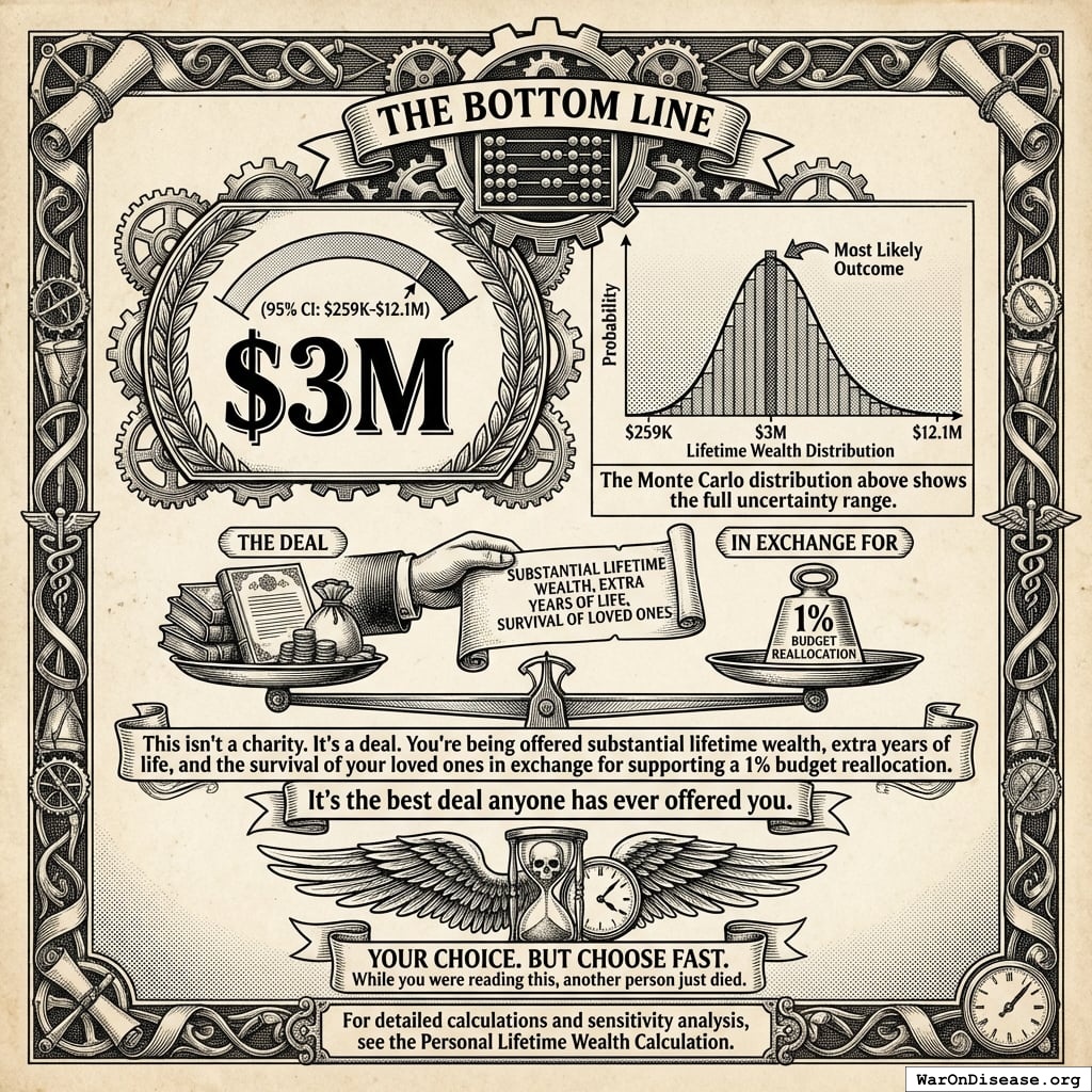 war-on-disease, 1-percent-treaty, medical-research, public-health, peace-dividend, decentralized-trials, dfda, dih, victory-bonds, health-economics, cost-benefit-analysis, clinical-trials, drug-development, regulatory-reform, military-spending, peace-economics, decentralized-governance, wishocracy, blockchain-governance, impact-investing