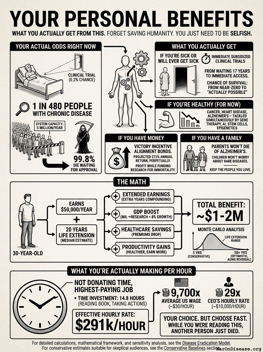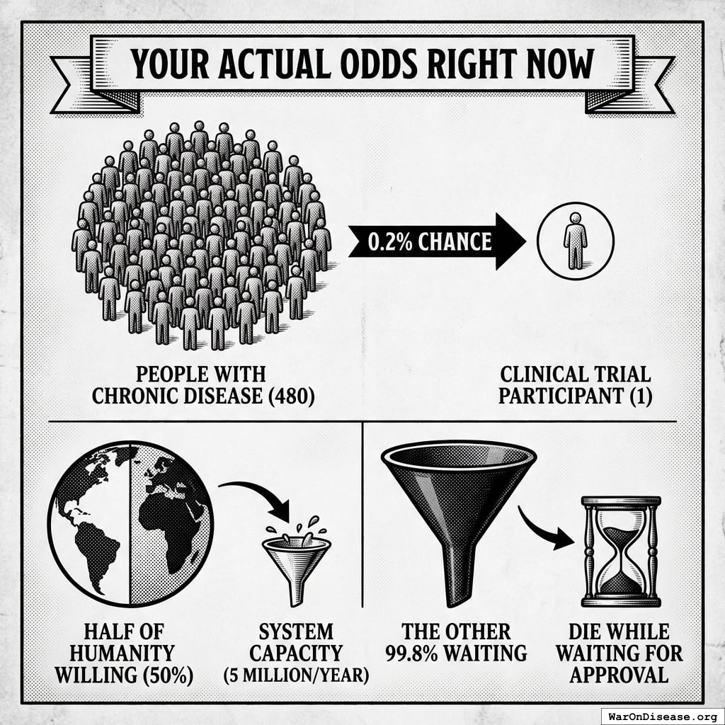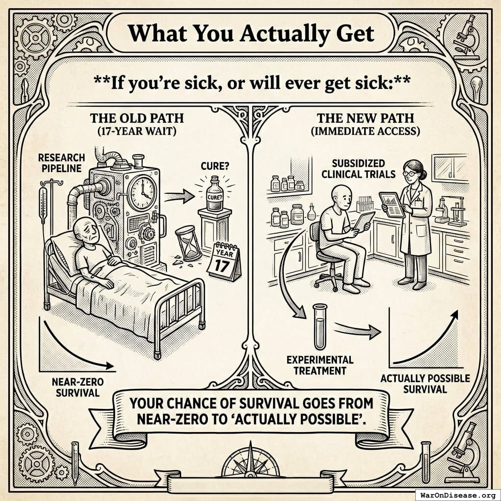Instead of waiting 17 years for a cure that may never come, you get immediate access to subsidized clinical trials for every disease. Your chance of survival goes from near-zero to “actually possible.”