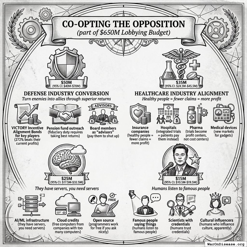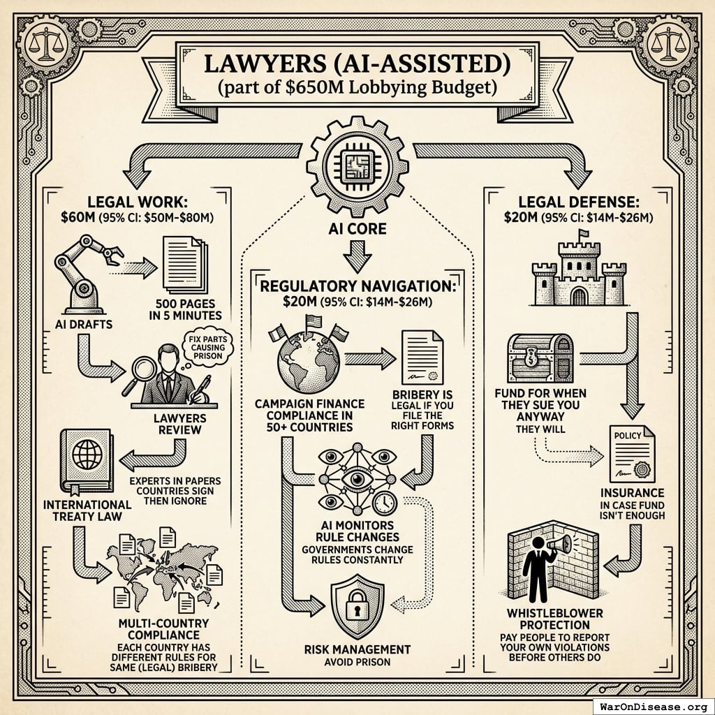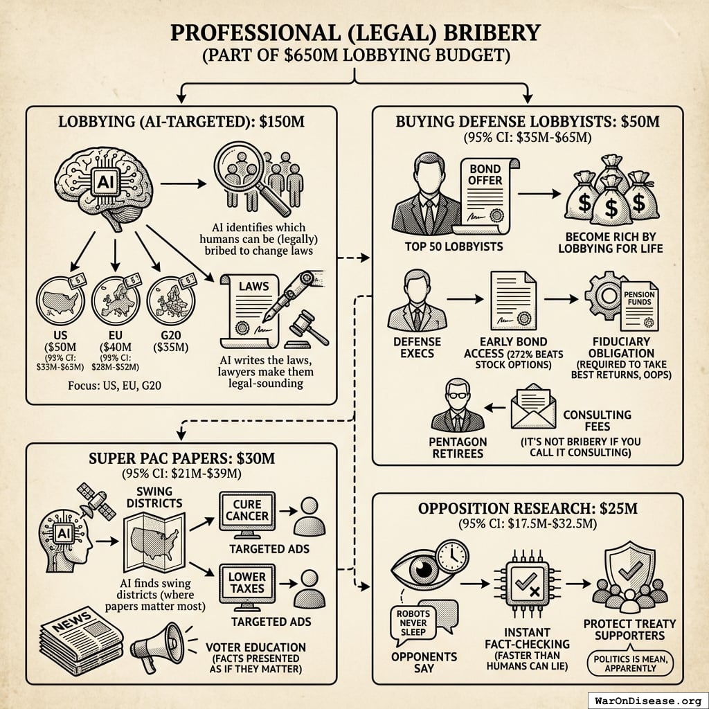 • Strategic lobbying: $50M (95% CI: $35M-$65M) (legally bribe only the humans who matter)