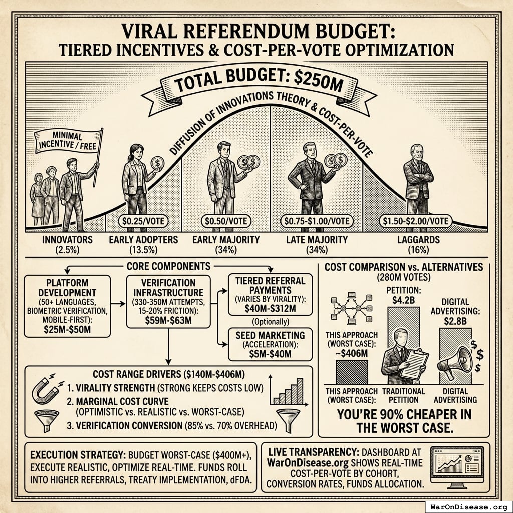Execution Strategy: Budget for worst-case ($400M+), execute with realistic assumptions, optimize in real-time based on actual cost-per-vote data. Unused funds roll into higher referral payments, treaty implementation, or dFDA development.