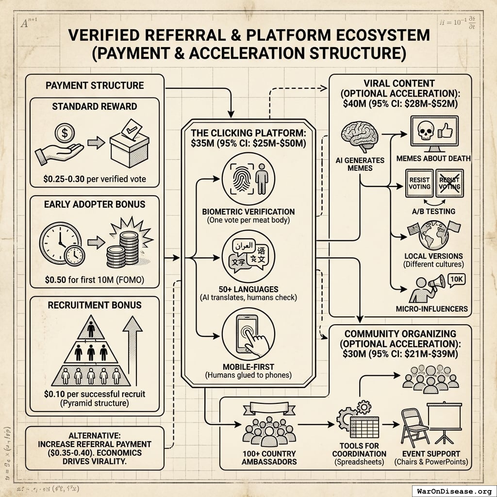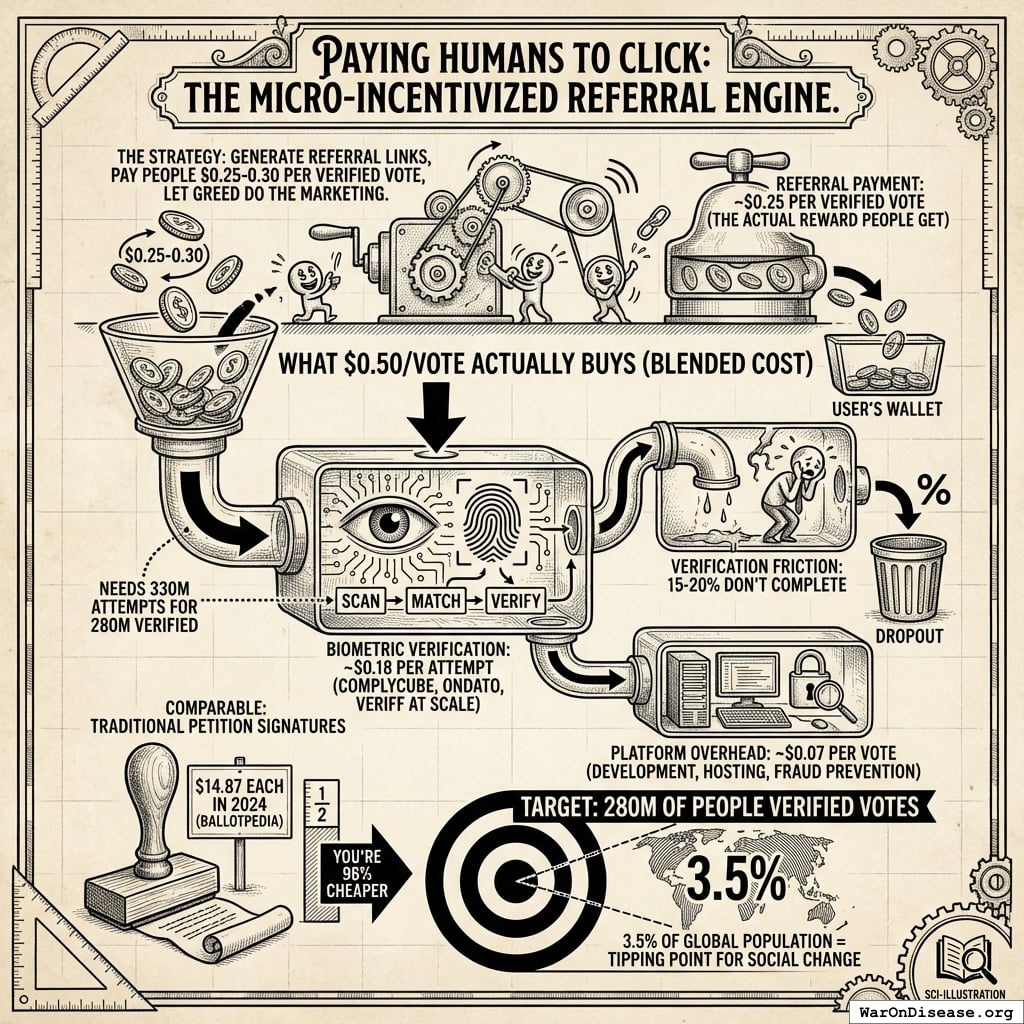 The strategy: Generate referral links, pay people $0.25-0.30 per verified vote, let greed do the marketing.