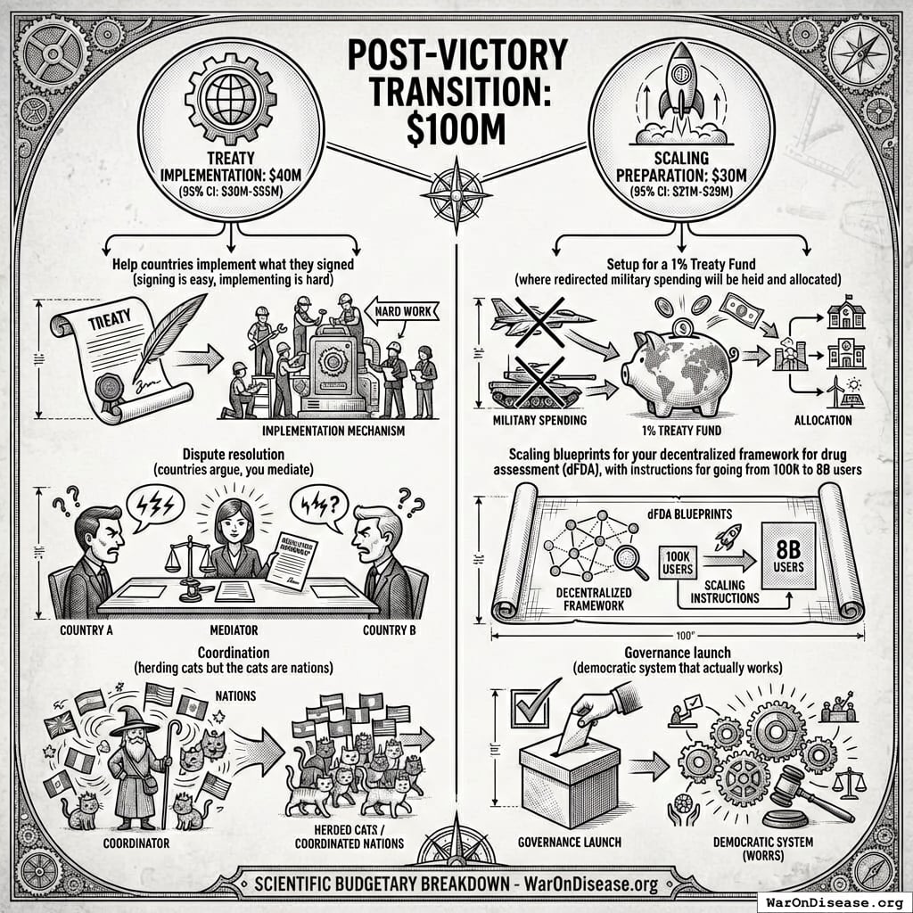 A financial breakdown of the 100M post-victory transition budget, illustrating the primary allocations for treaty implementation and scaling preparation with their respective confidence intervals.
