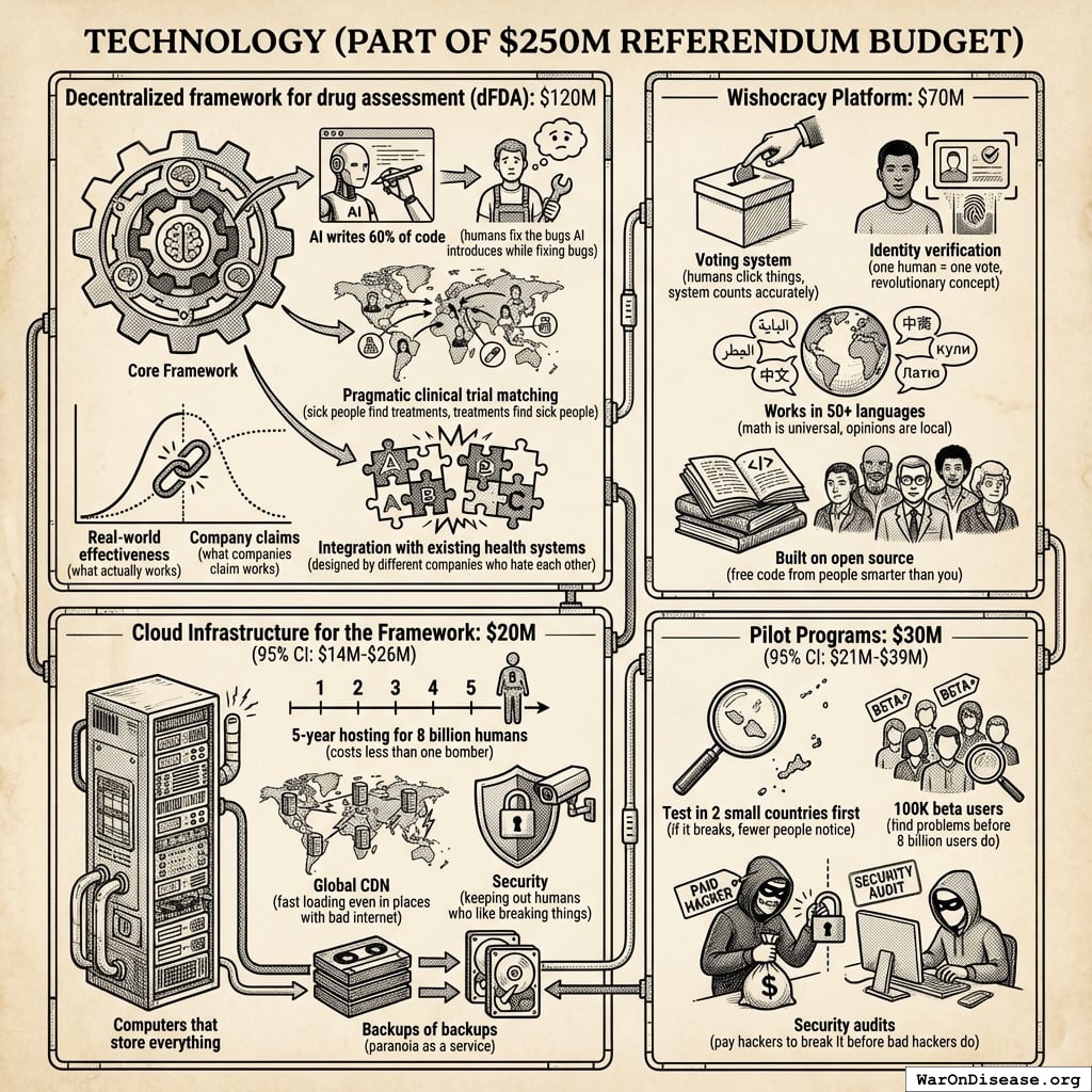Breakdown of the 250M technology budget across the dFDA framework, Wishocracy platform, pilot programs, and cloud infrastructure.