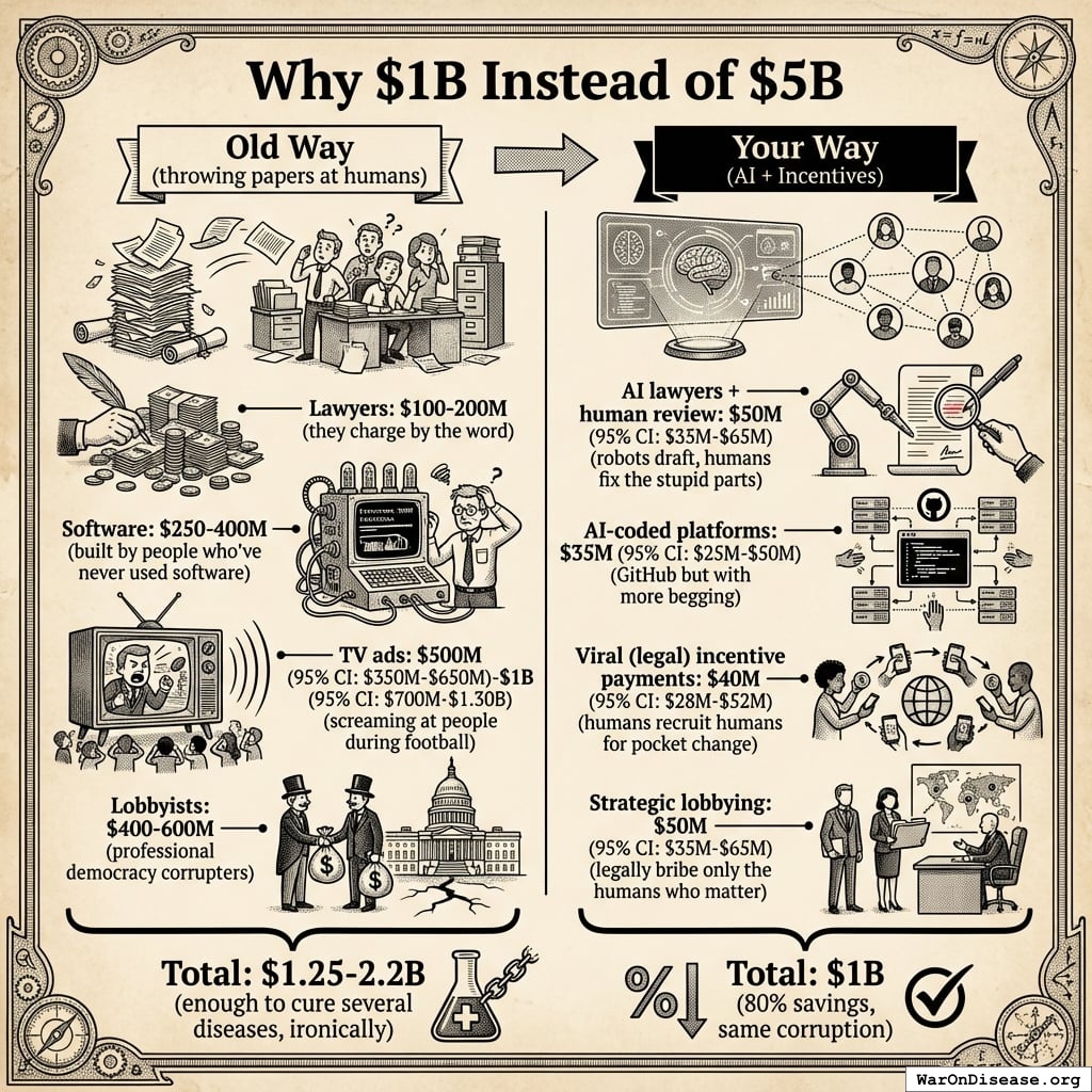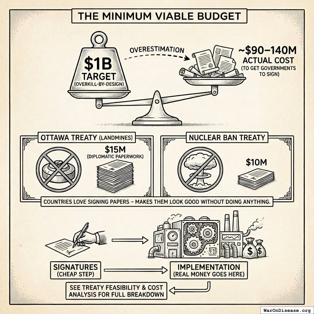 The $1B target is overkill-by-design. The actual cost to get governments to sign a piece of paper? Historically, ~$90–140 million.
